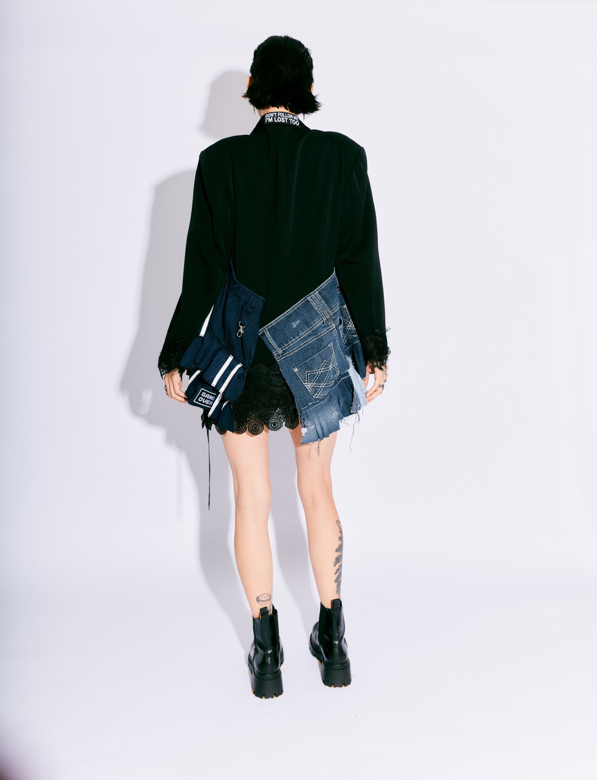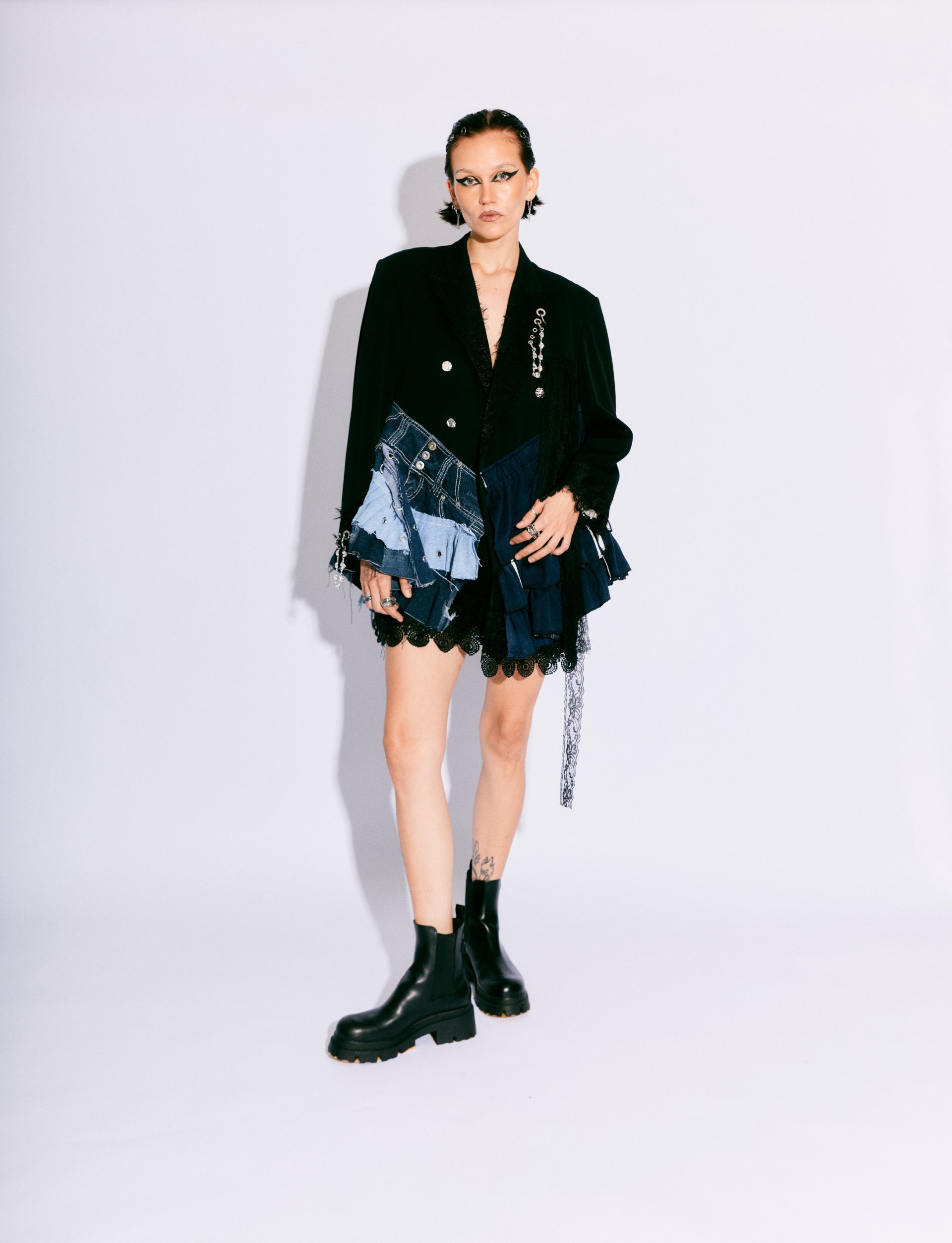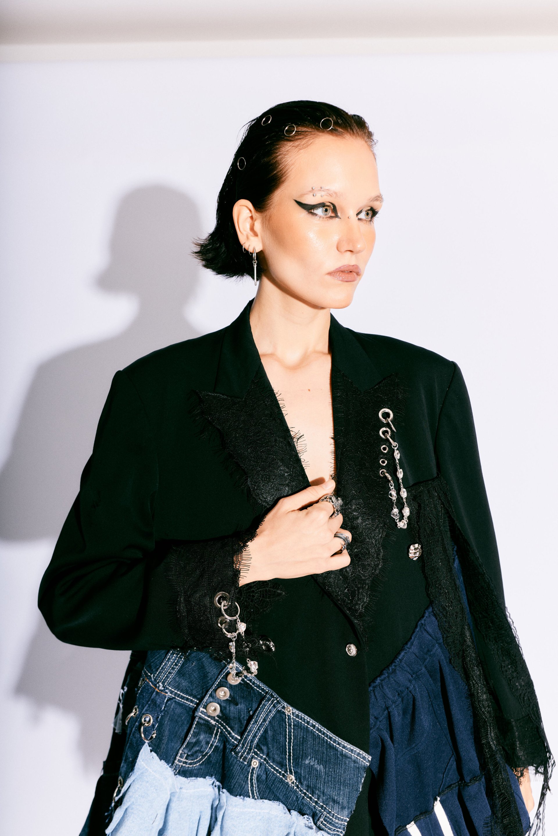 Handmade from layered vintage blazers, deconstructed skirts, lace, patchwork panels, and utilitarian hardware, this blazer showcases textural contrast and asymmetry as the core of its identity. Each layer is intentionally placed to build volume, movement, and rebellion—creating a dramatic silhouette that moves with the wearer like wearable architecture.