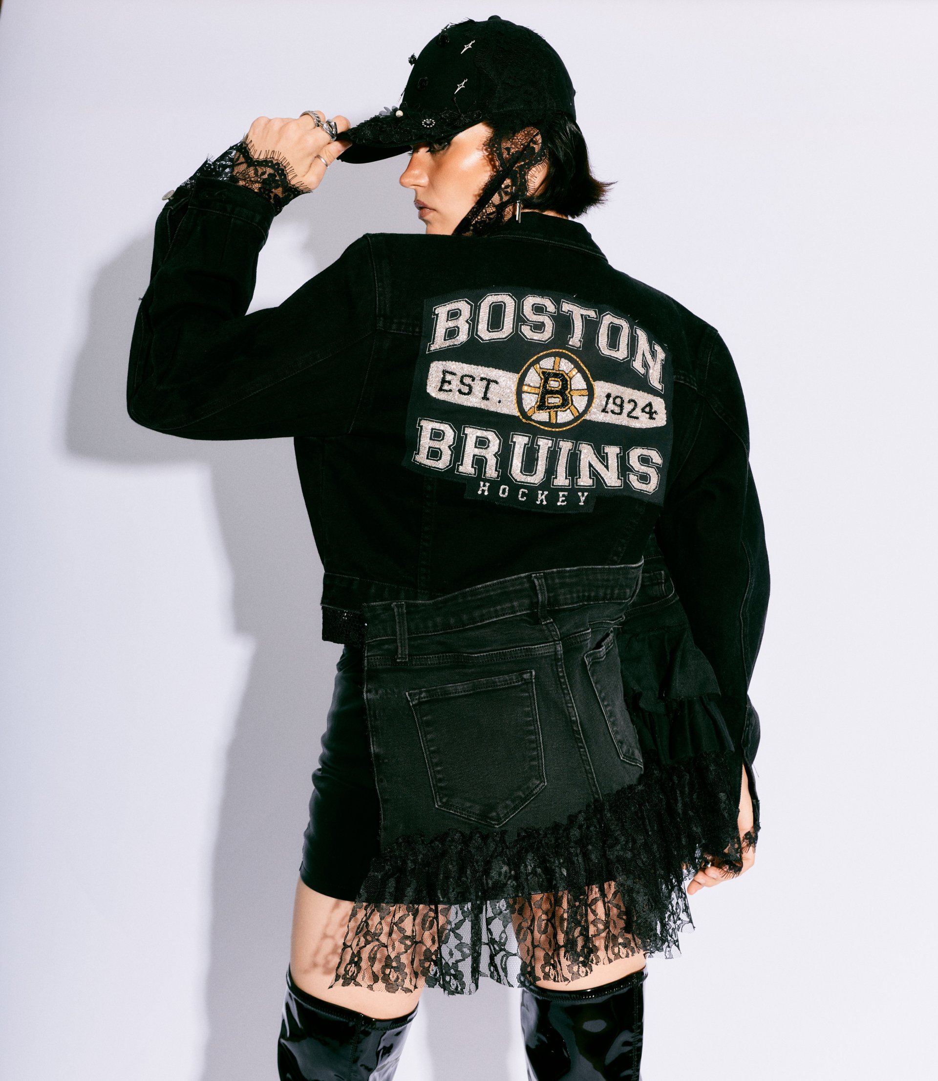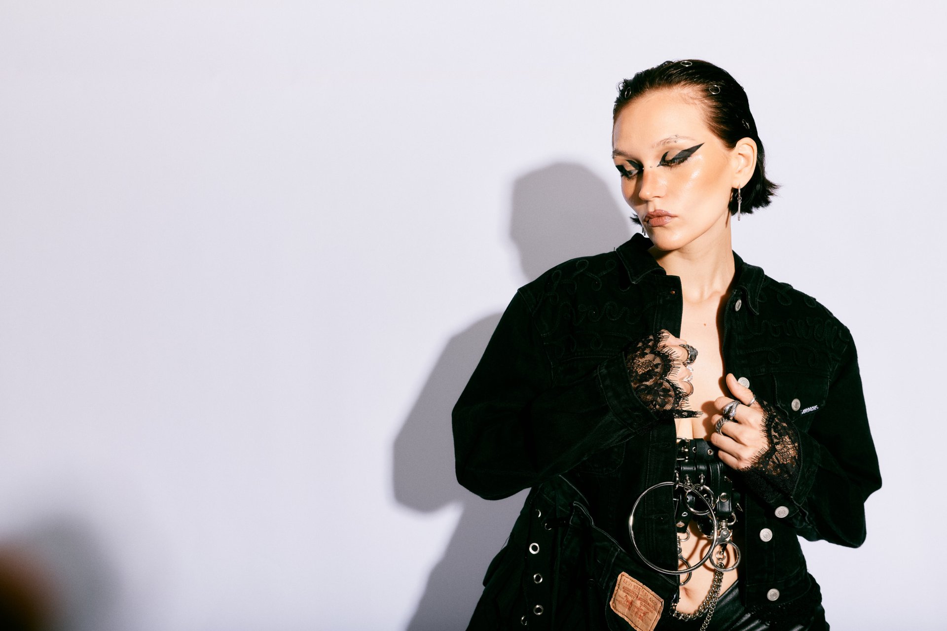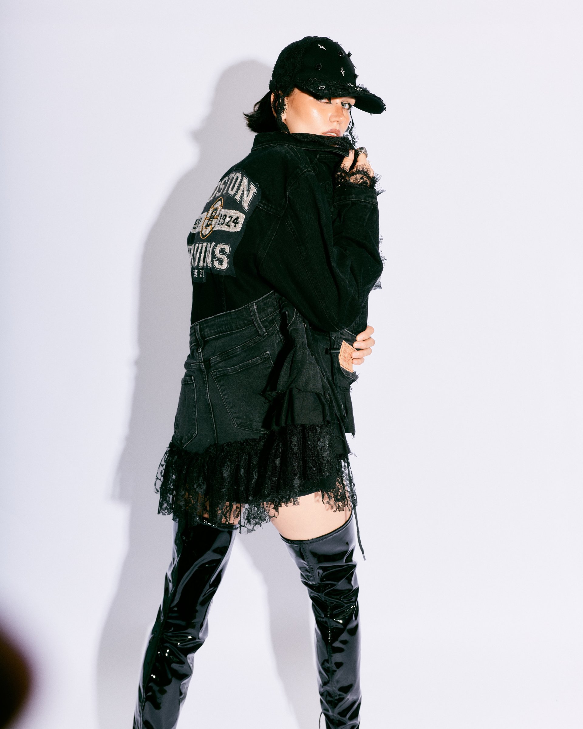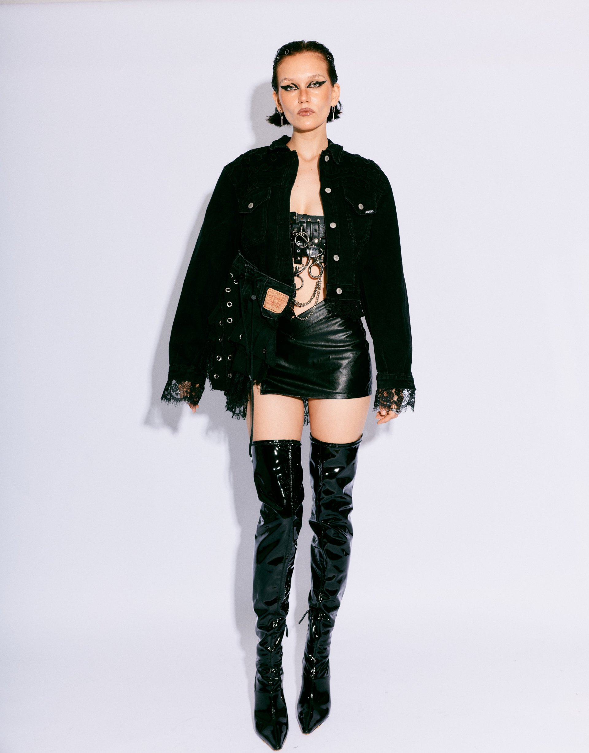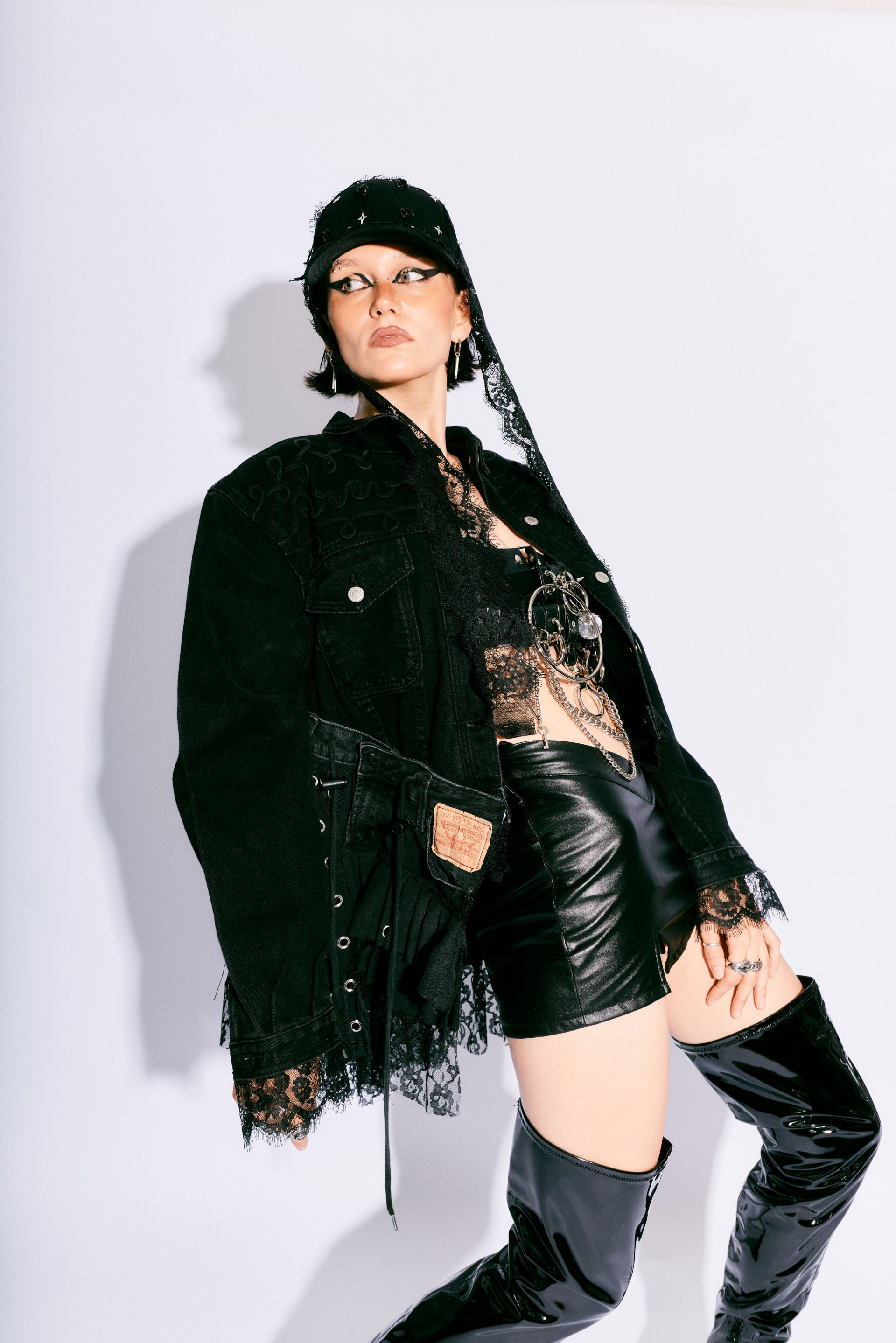 Handmade from layered vintage blazers, deconstructed skirts, lace, patchwork panels, and utilitarian hardware, this blazer showcases textural contrast and asymmetry as the core of its identity. Each layer is intentionally placed to build volume, movement, and rebellion—creating a dramatic silhouette that moves with the wearer like wearable architecture.