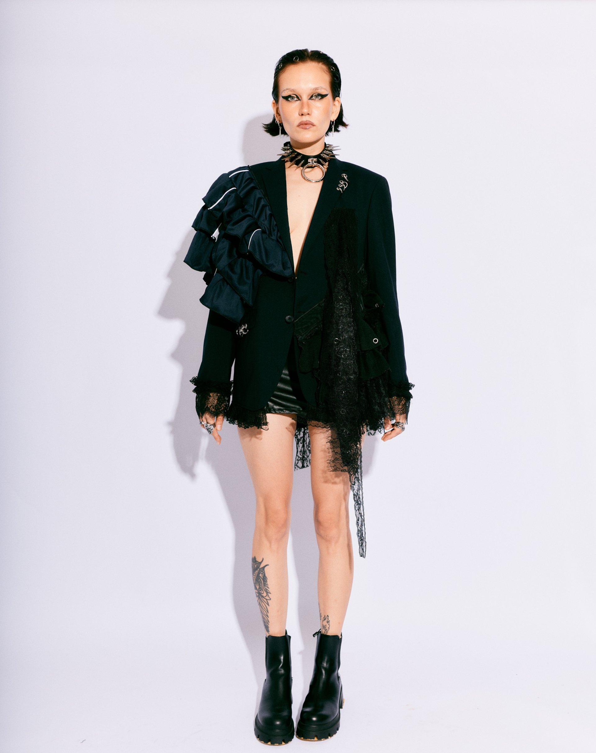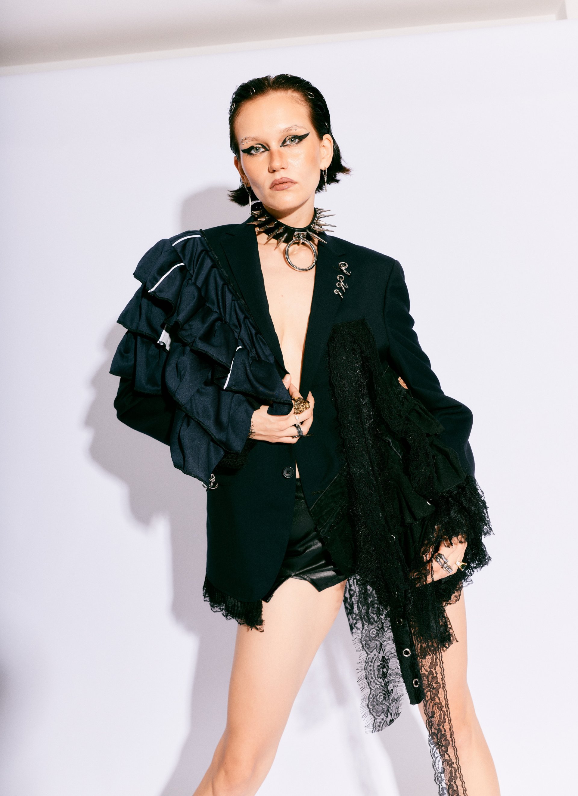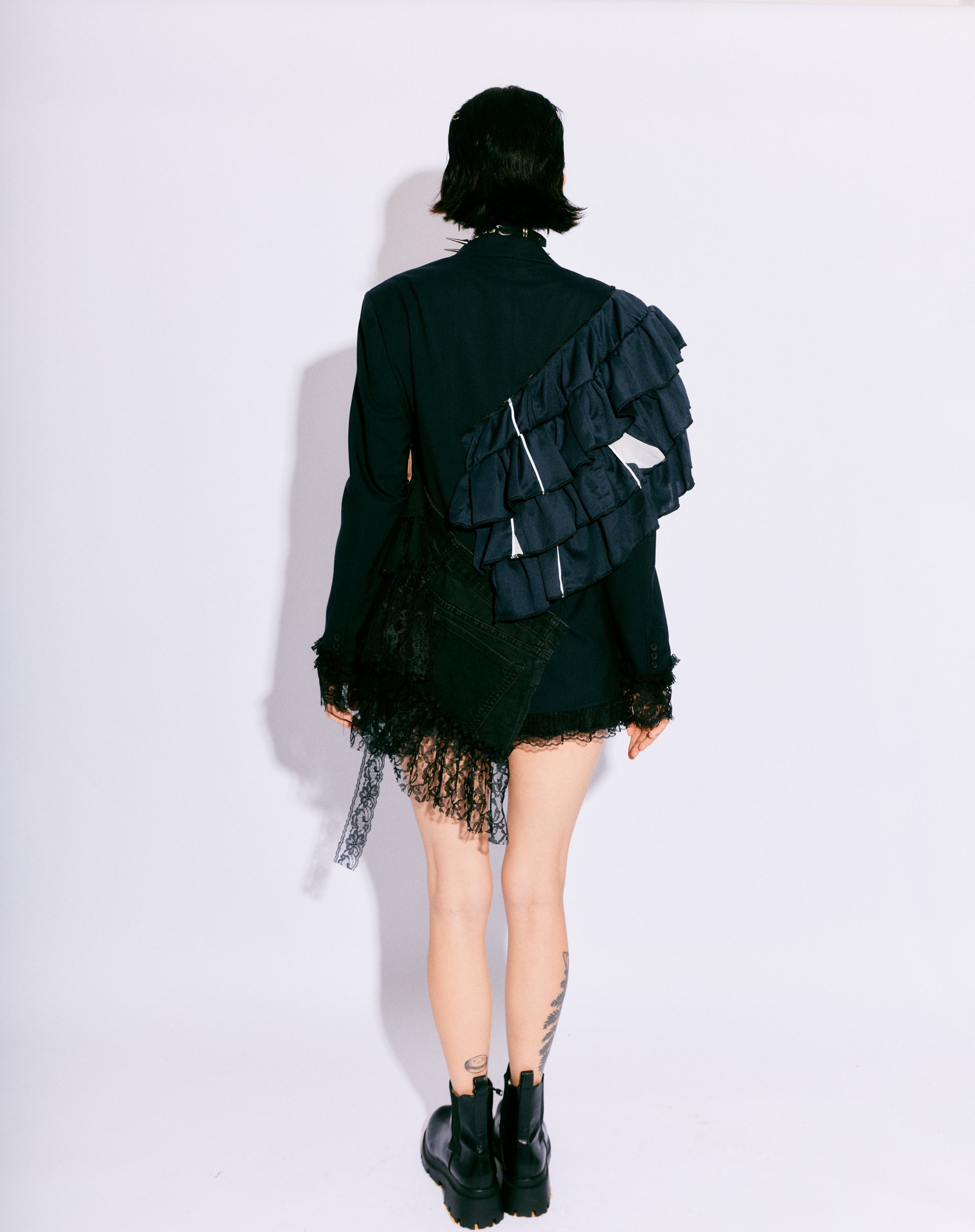 Handmade from layered vintage blazers, deconstructed skirts, lace, patchwork panels, and utilitarian hardware, this blazer showcases textural contrast and asymmetry as the core of its identity. Each layer is intentionally placed to build volume, movement, and rebellion—creating a dramatic silhouette that moves with the wearer like wearable architecture.
