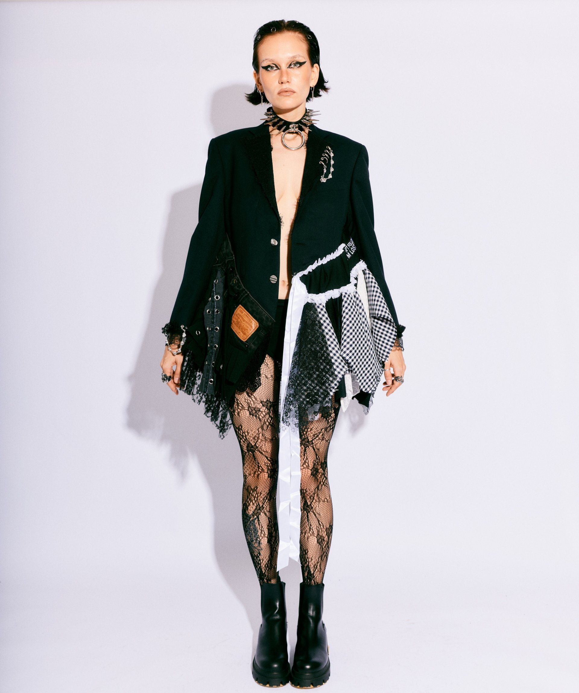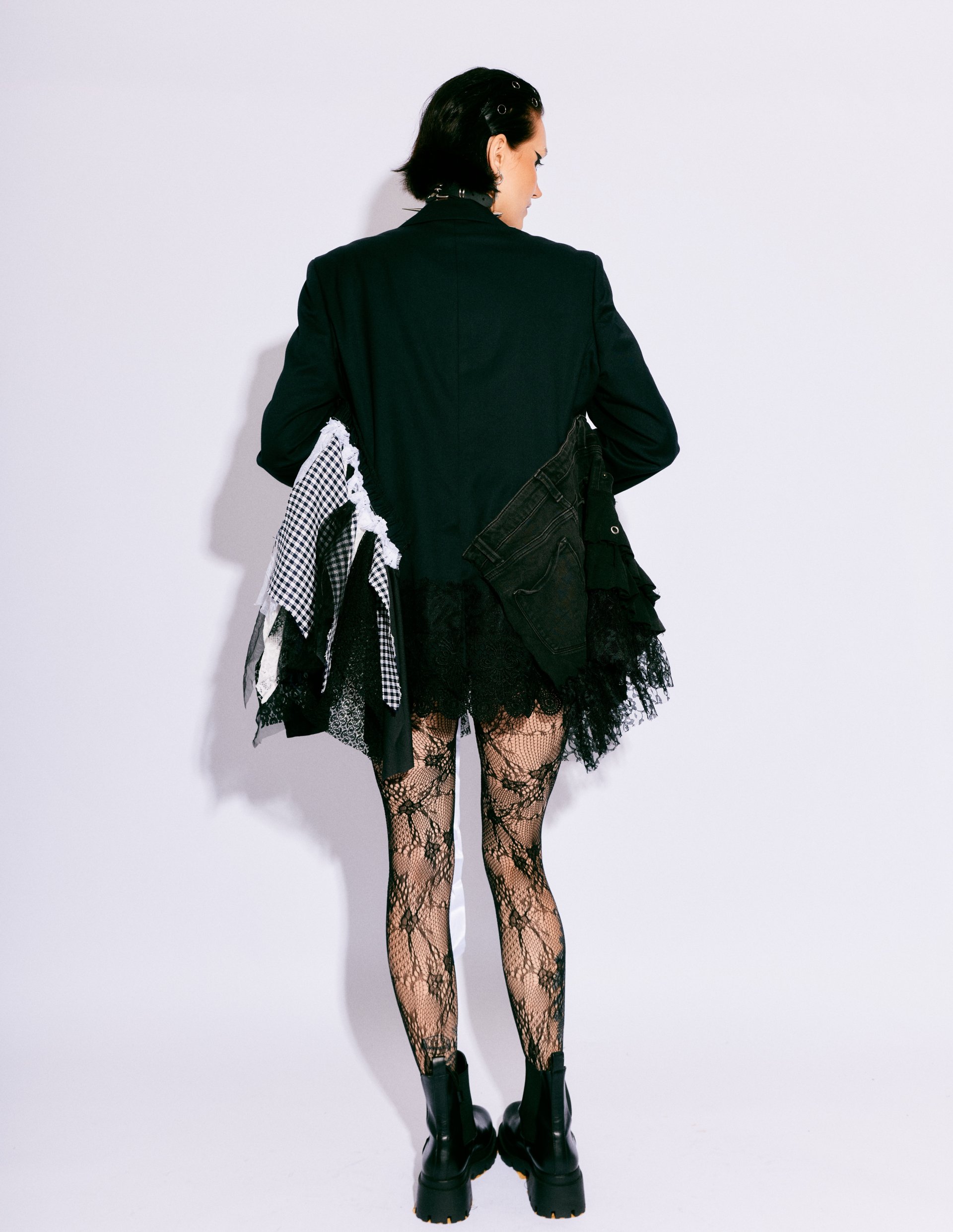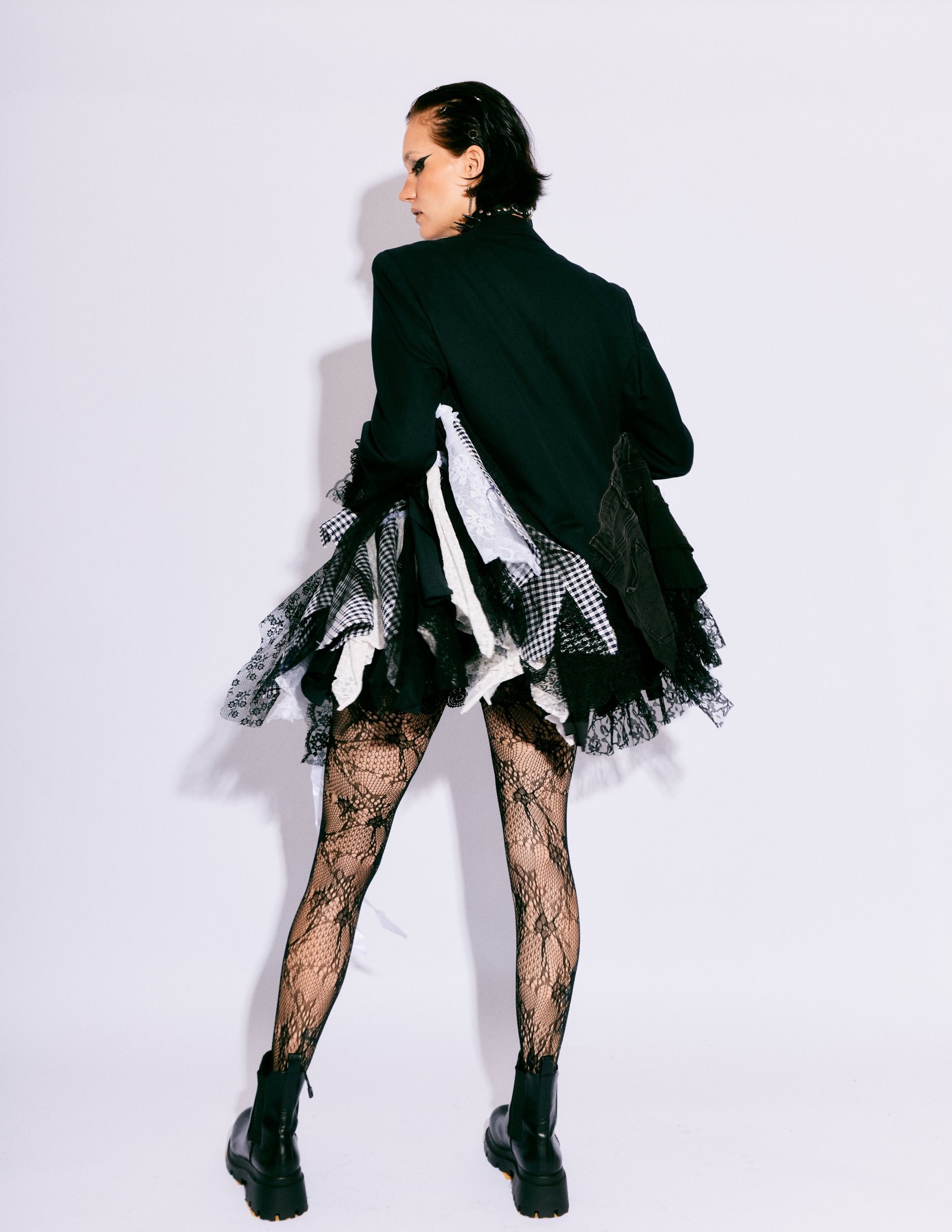 Handmade from layered vintage blazers, deconstructed skirts, lace, patchwork panels, and utilitarian hardware, this blazer showcases textural contrast and asymmetry as the core of its identity. Each layer is intentionally placed to build volume, movement, and rebellion—creating a dramatic silhouette that moves with the wearer like wearable architecture.
