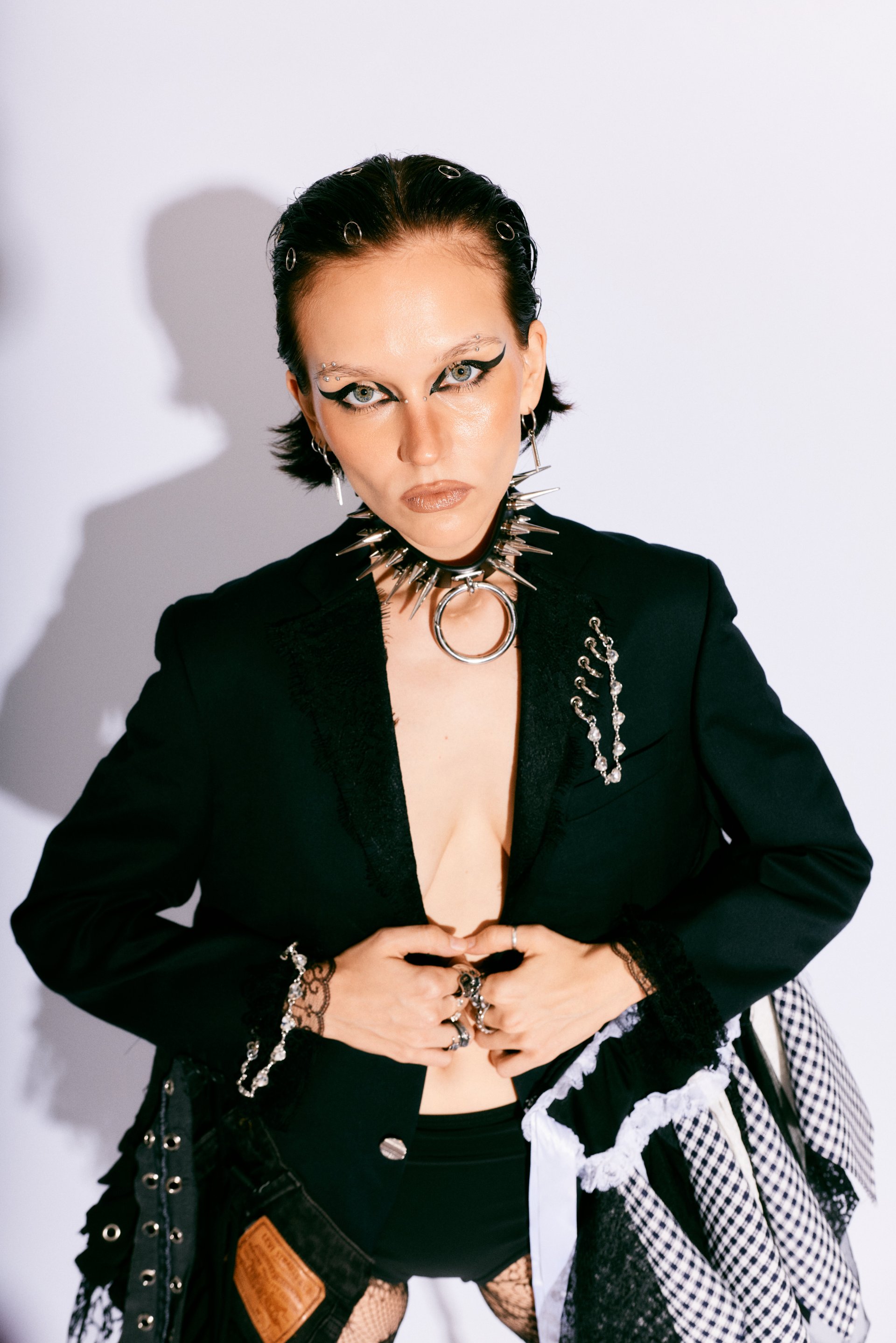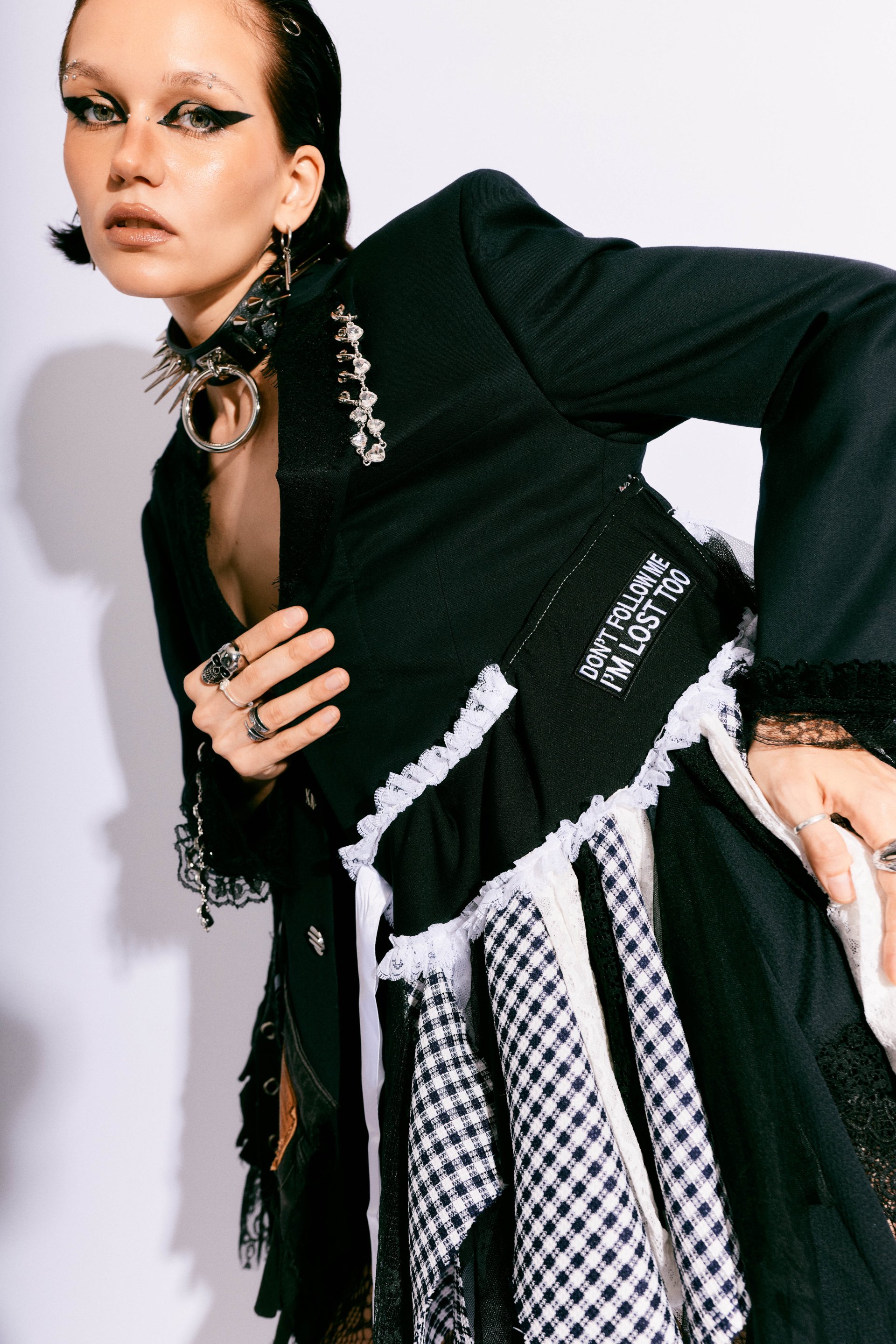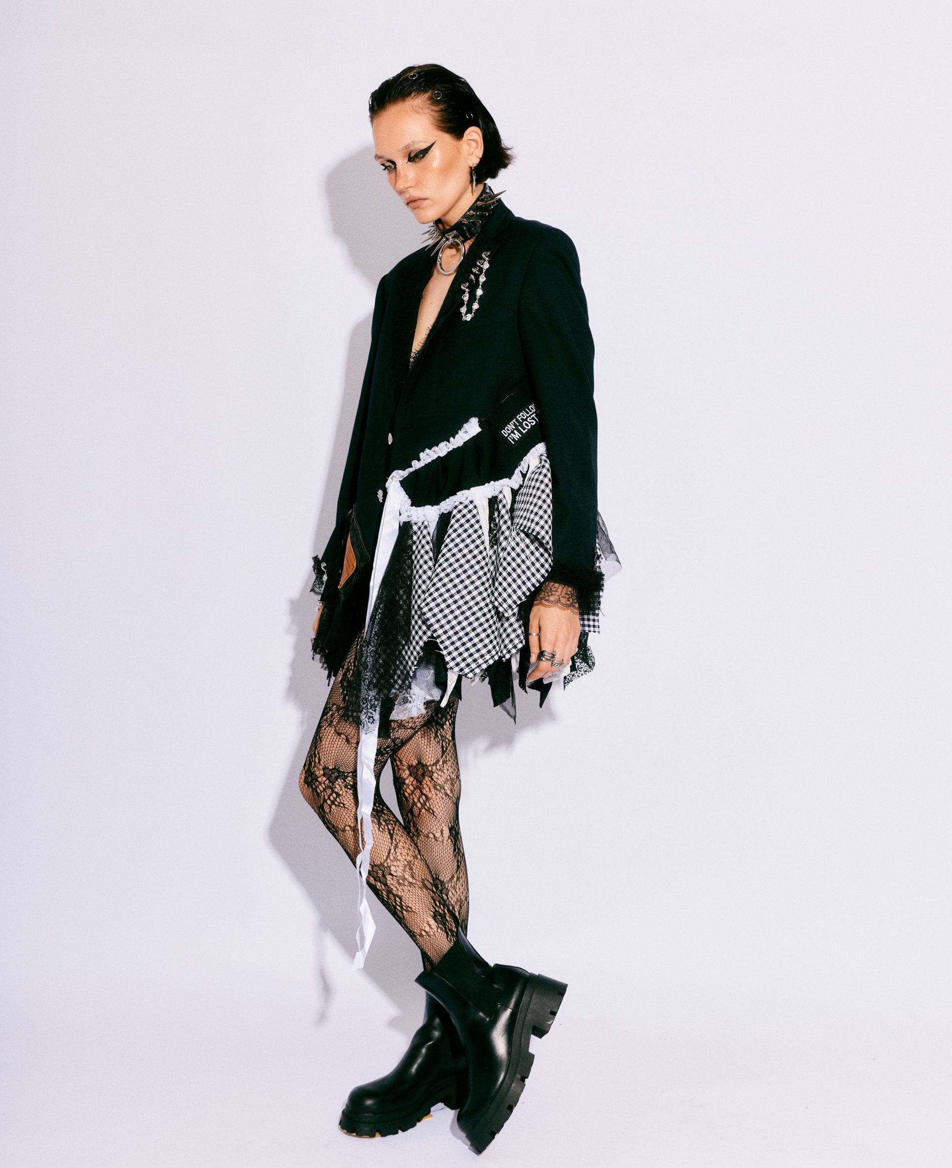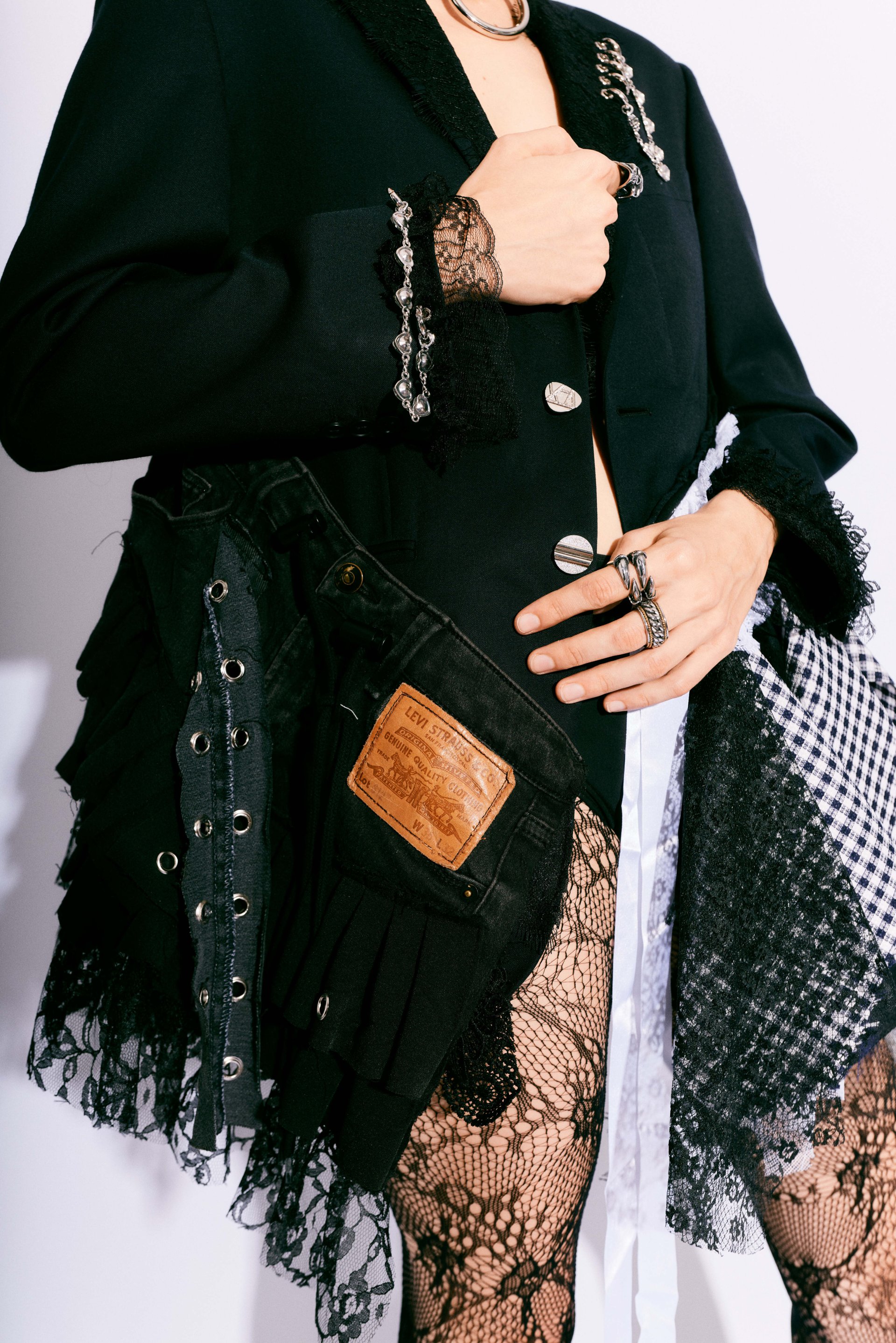 Handmade from layered vintage blazers, deconstructed skirts, lace, patchwork panels, and utilitarian hardware, this blazer showcases textural contrast and asymmetry as the core of its identity. Each layer is intentionally placed to build volume, movement, and rebellion—creating a dramatic silhouette that moves with the wearer like wearable architecture.