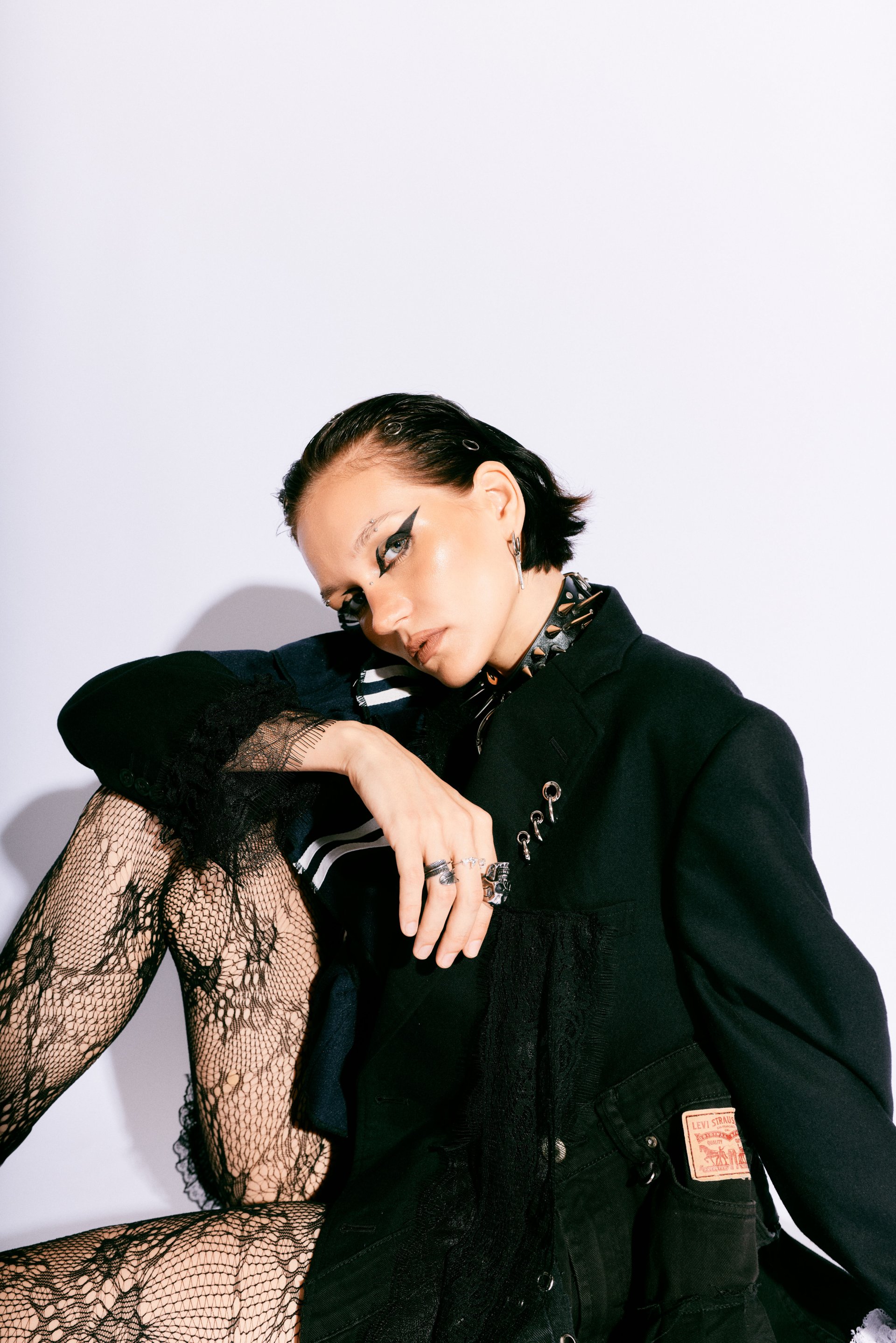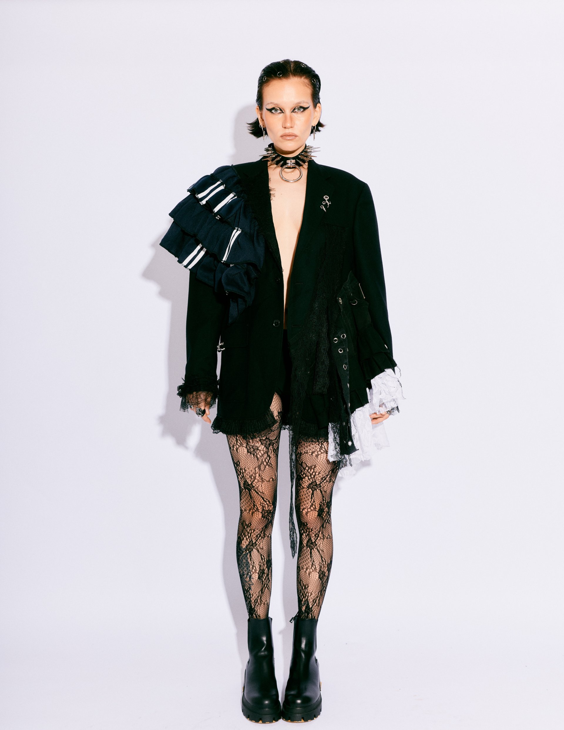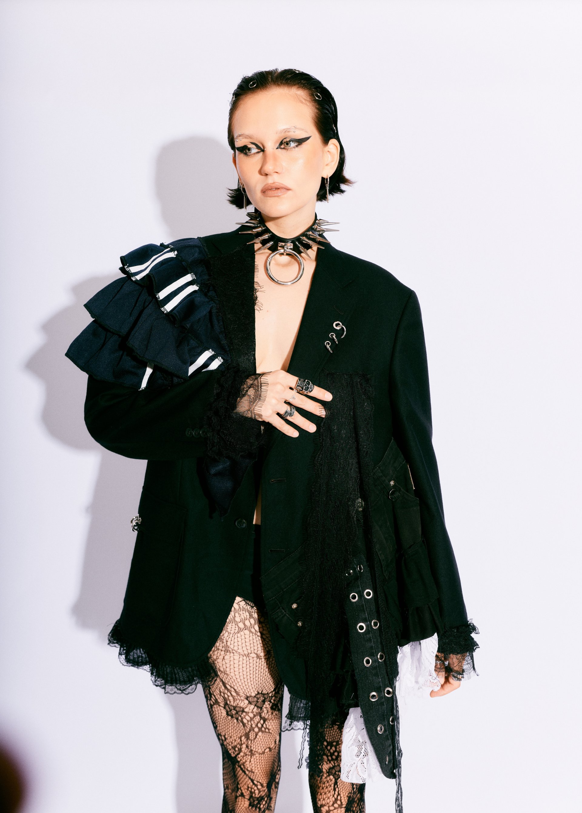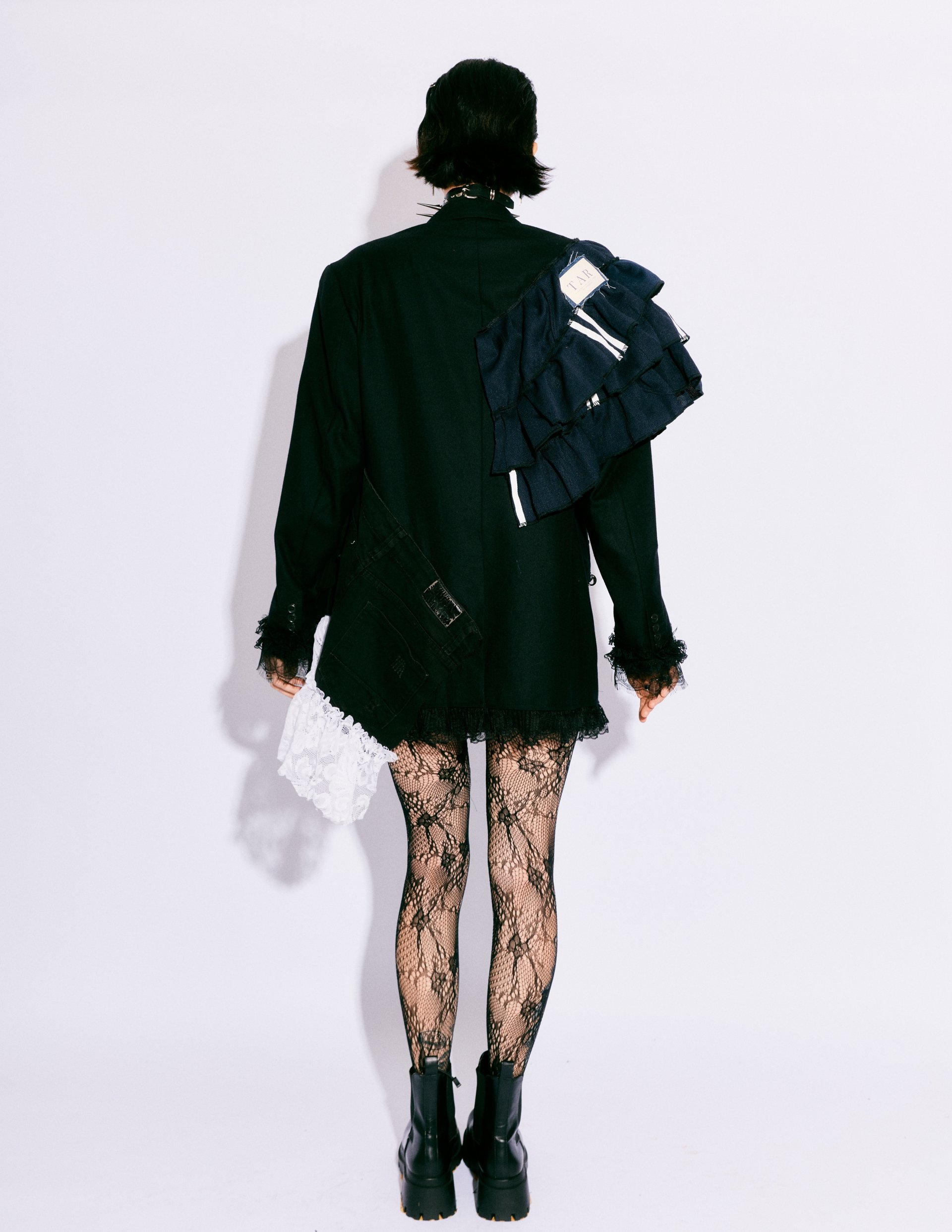 Handmade from layered vintage blazers, deconstructed skirts, lace, patchwork panels, and utilitarian hardware, this blazer showcases textural contrast and asymmetry as the core of its identity. Each layer is intentionally placed to build volume, movement, and rebellion—creating a dramatic silhouette that moves with the wearer like wearable architecture.