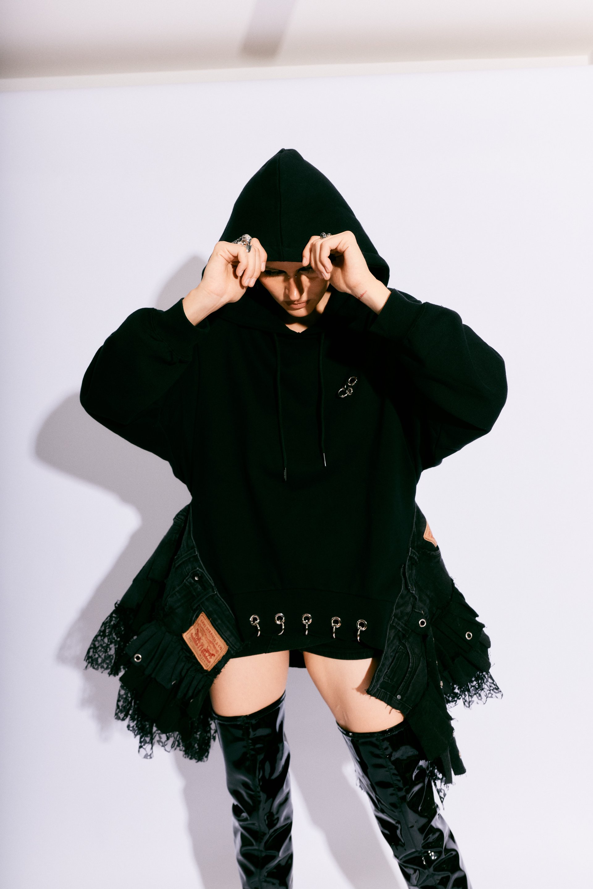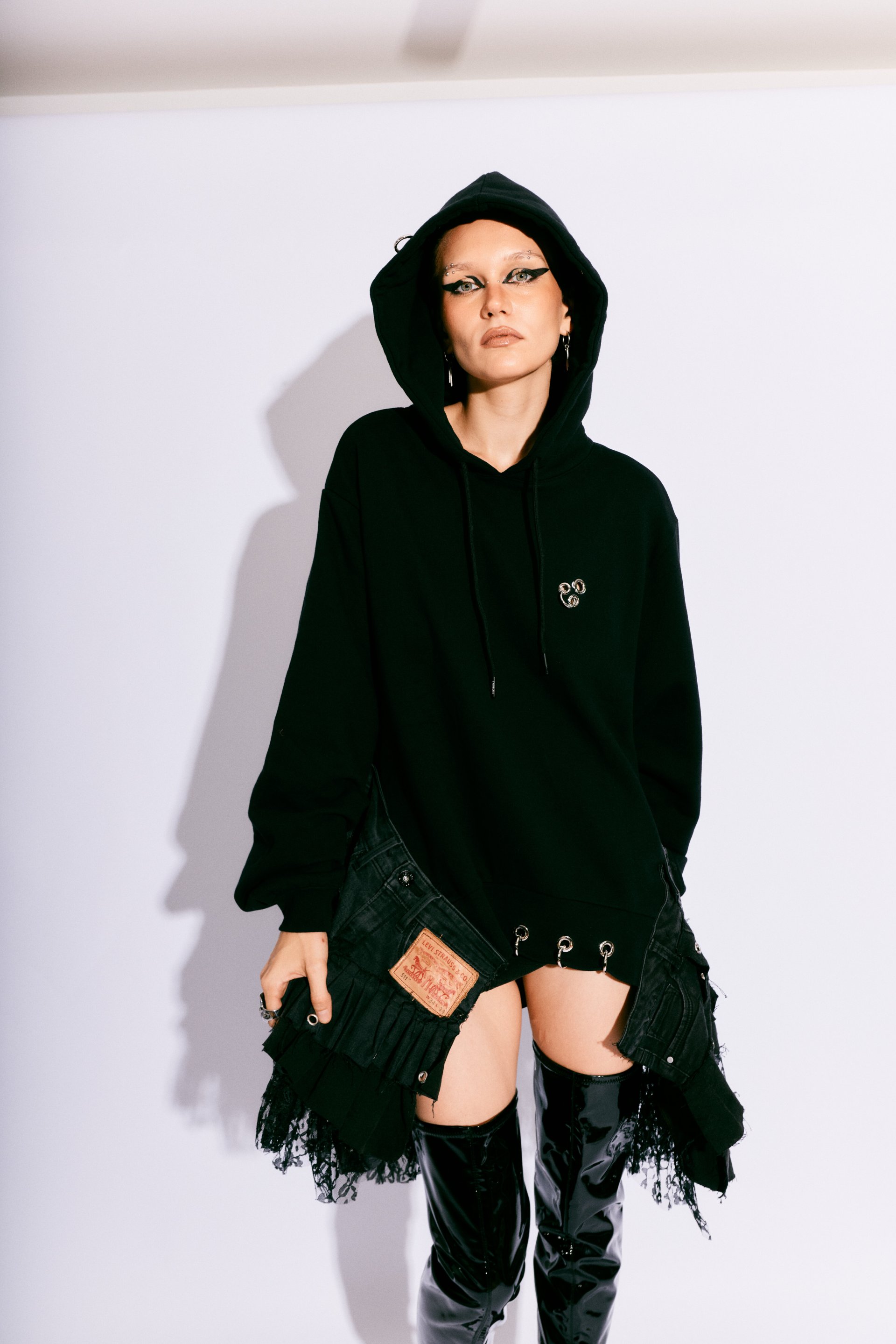 An oversized black hoodie is transformed into a couture silhouette through the deconstruction of vintage denim and the delicate layering of black lace. Each denim panel is hand-selected from pre-loved vintage Levi’s®, reinterpreted with raw edges, eyelet hardware, grommets, and safety-pin inspired rings—creating a multi-dimensional flare that mimics a sculptural skirt effect. The asymmetrical lace drape adds movement, contrast, and a dark romantic aura.
