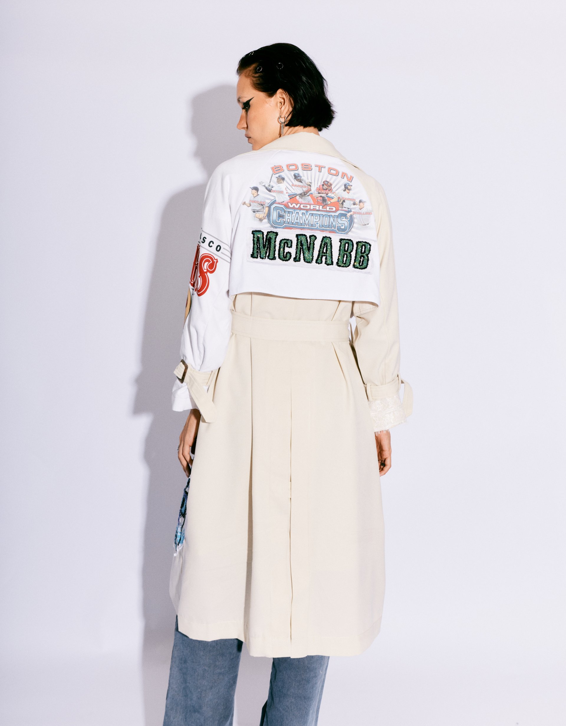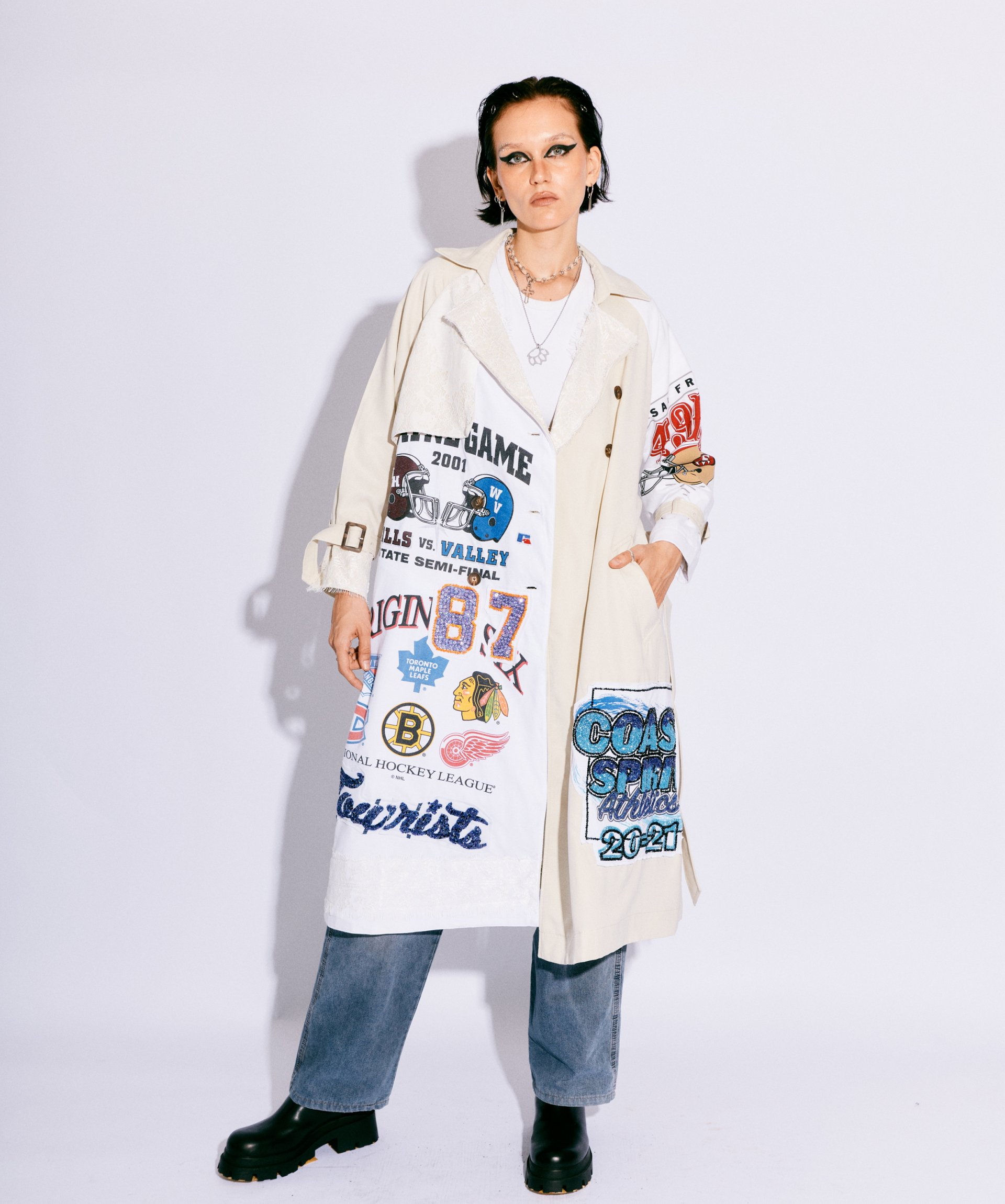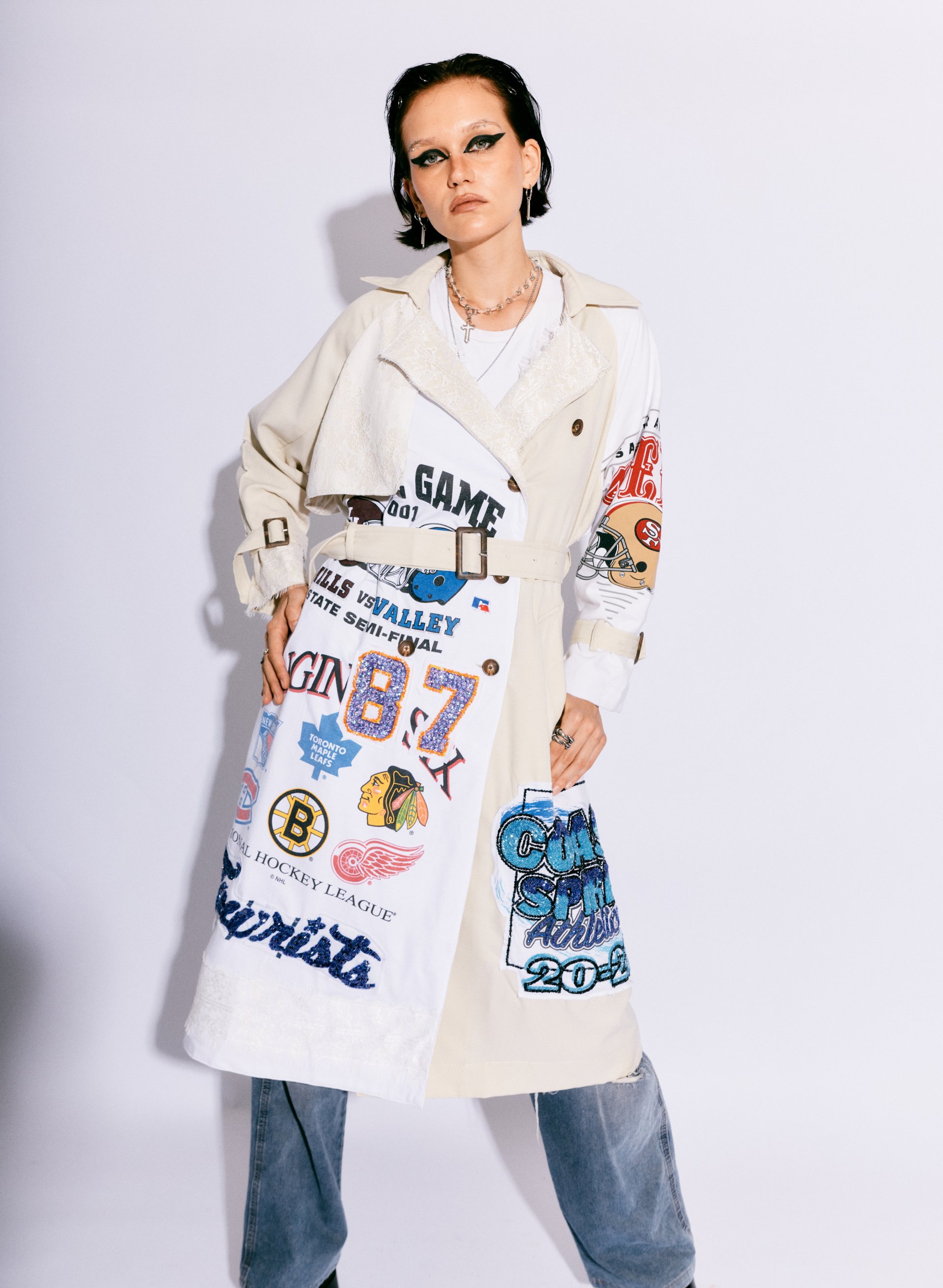 This trench coat is masterfully reconstructed from authentic vintage T-shirts sourced from around the world—each panel carries graphic history, character, and cultural storytelling. The piece is fully engineered into a tailored overcoat silhouette, combining street nostalgia with avant-garde couture structure. The unexpected fusion of soft cotton tees and trench coat architecture creates a dramatic contrast of casual heritage and high-fashion presence.