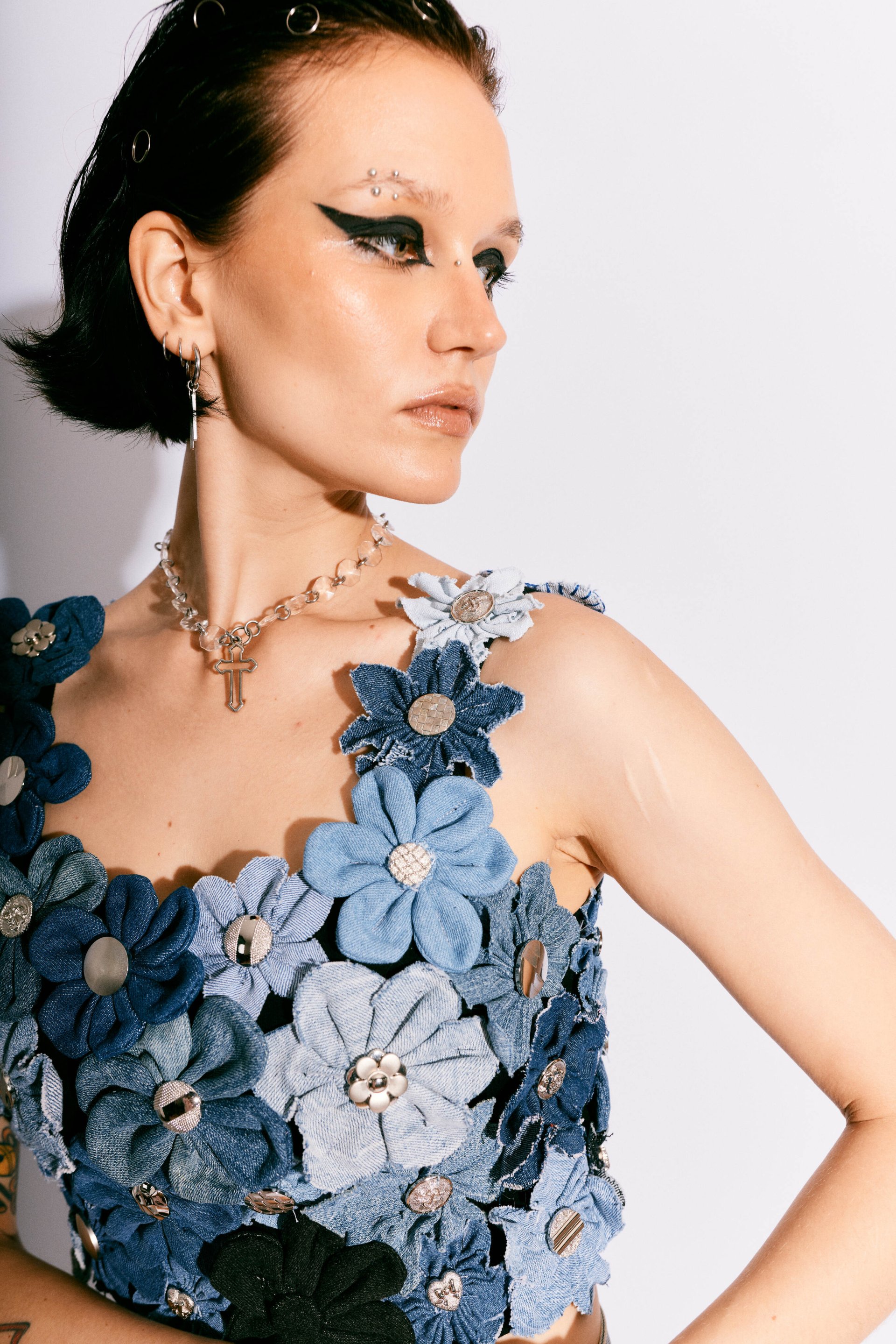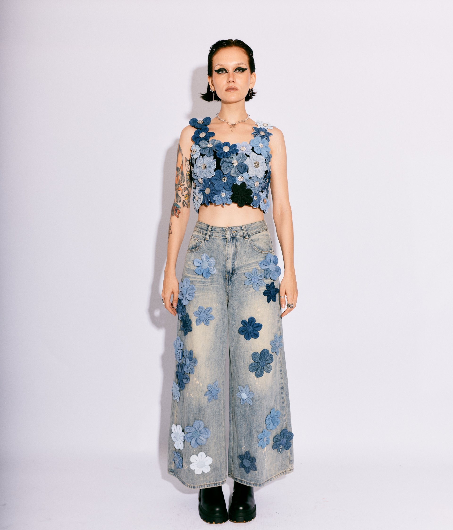 The BLOOMIN’ BLUE CROP TOP blossoms from the fragments of denim past — a garden of reconstructed texture, hand-sculpted florals, and metallic nostalgia. Each flower is cut, folded, and assembled by hand from reclaimed denim, embellished with vintage buttons and hardware sourced from TARMAFIA’s archive.