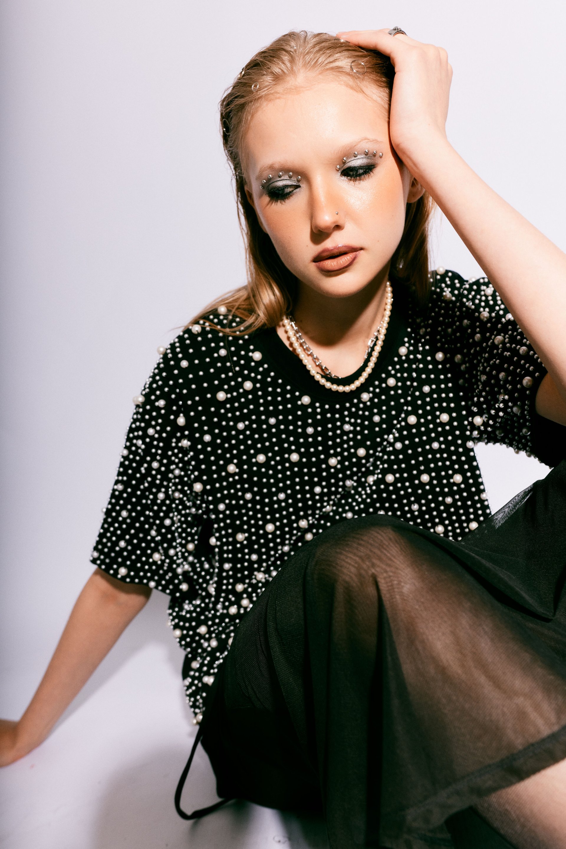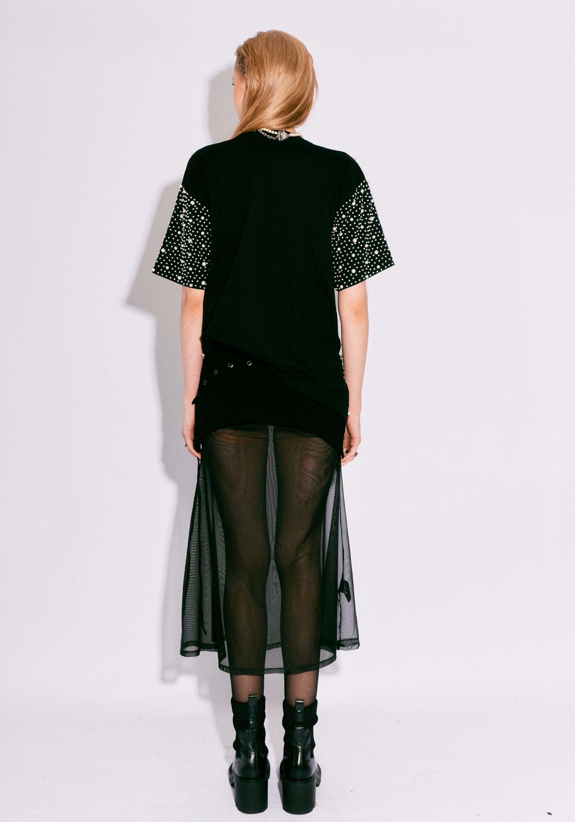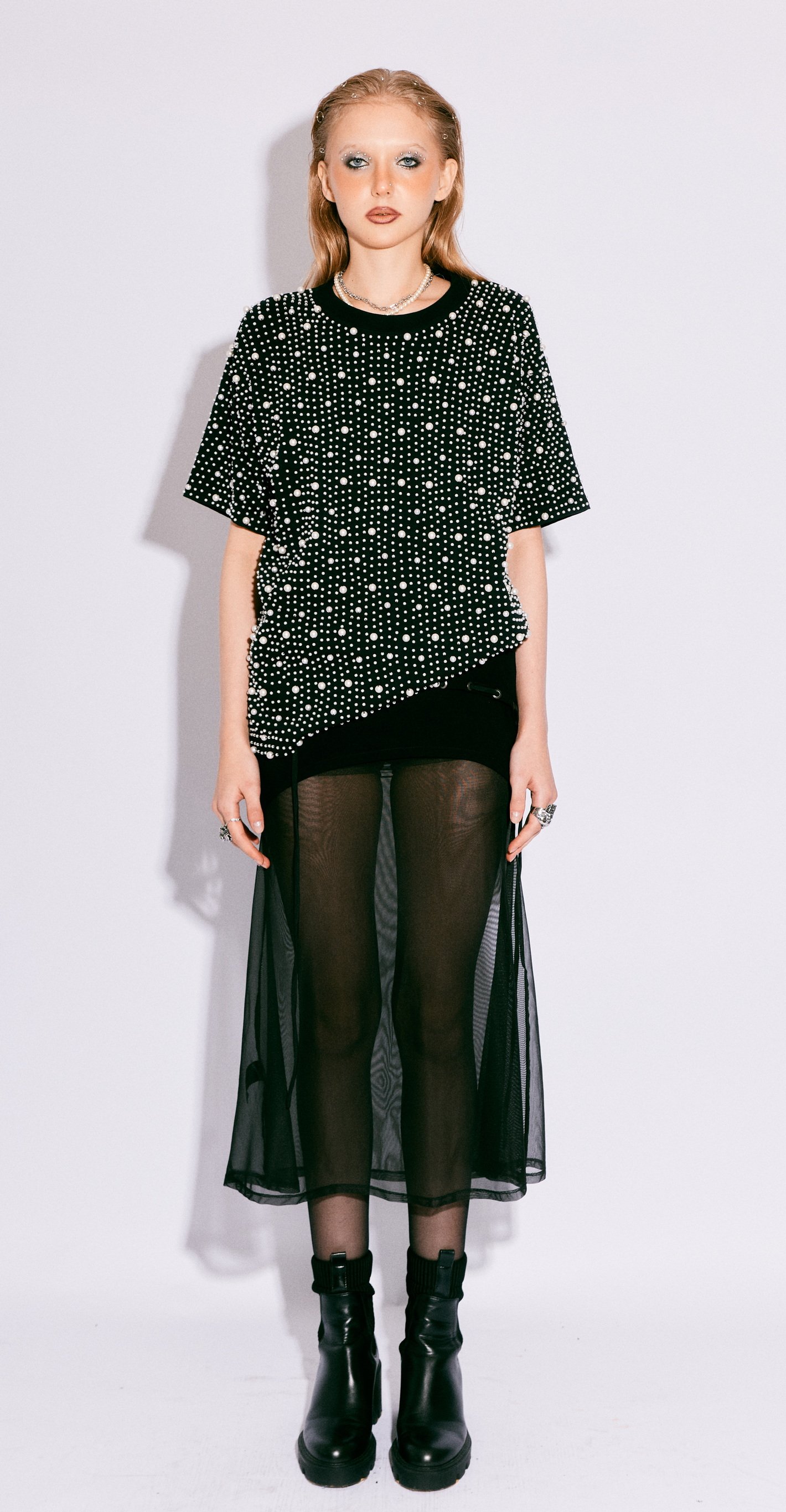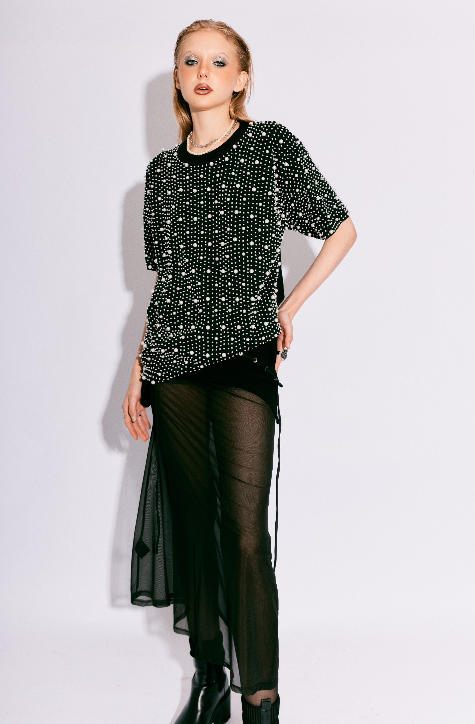 The PEARL COTTON TEE transforms a wardrobe essential into a statement of handcrafted luxury. Each shirt is meticulously hand-embroidered with hundreds of individually sewn pearls, creating a hypnotic texture of shimmer and shadow across soft cotton.