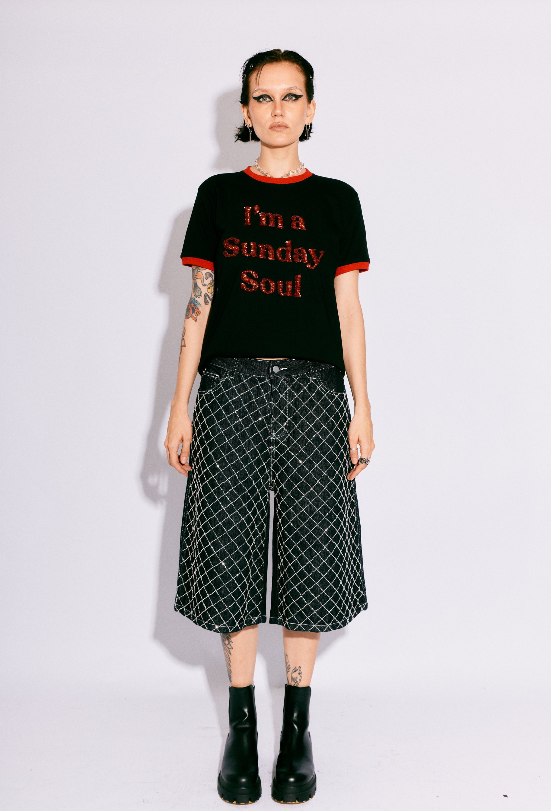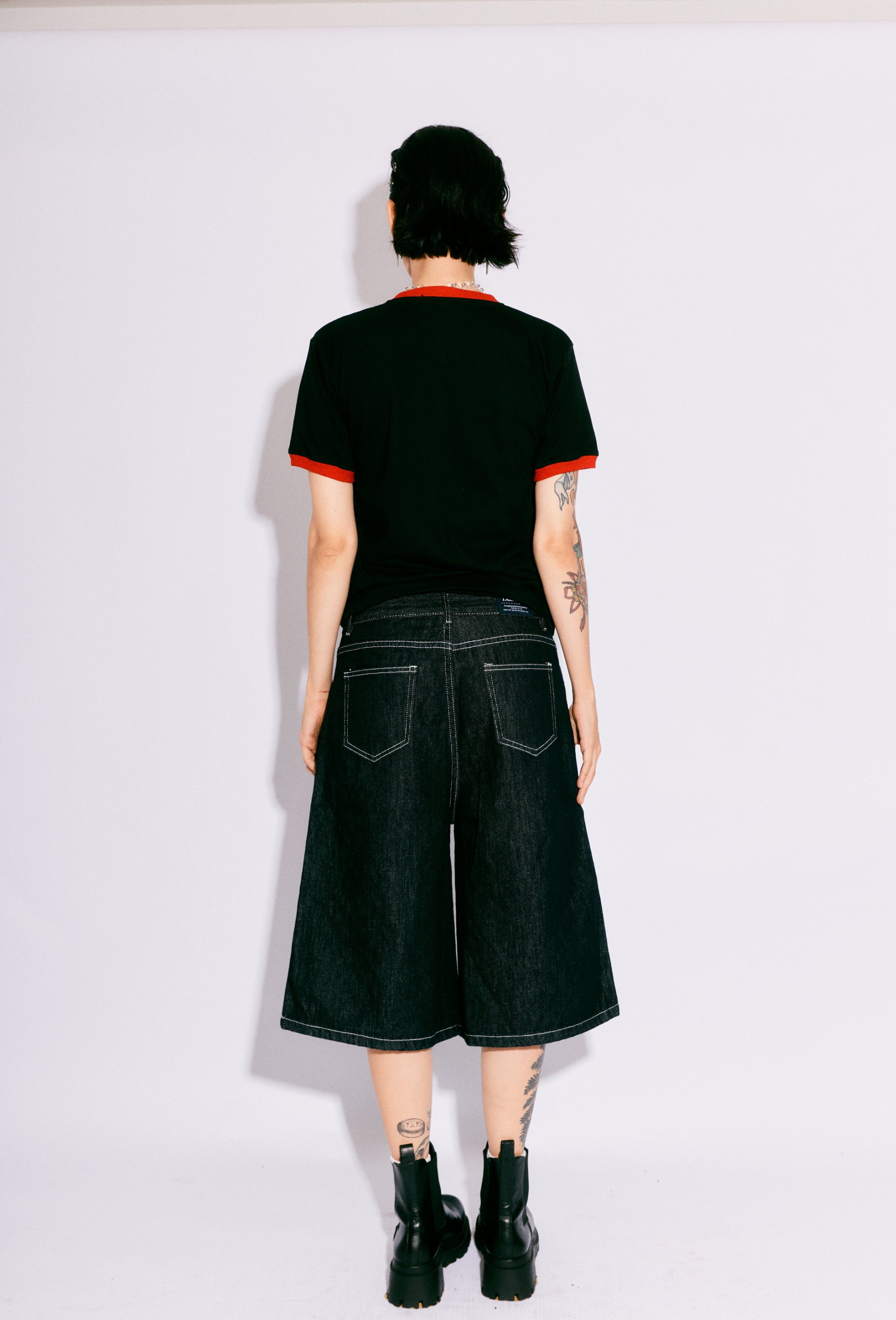 A reimagined silhouette between culotte and street pant, the structured cut sits high on the waist and falls in a relaxed, architectural drape. Each intersecting stitch represents hours of manual craftsmanship, turning raw denim into wearable sculpture.