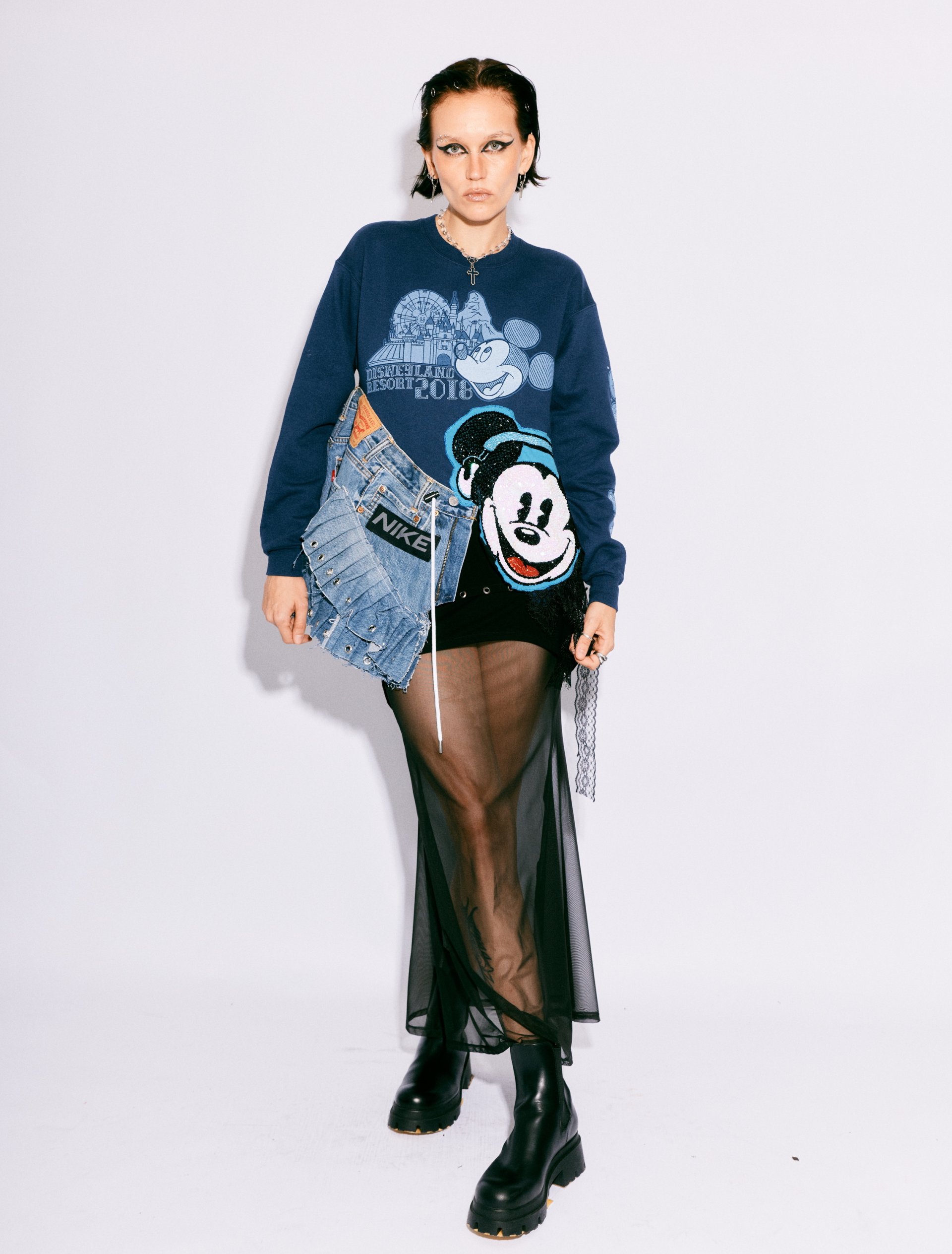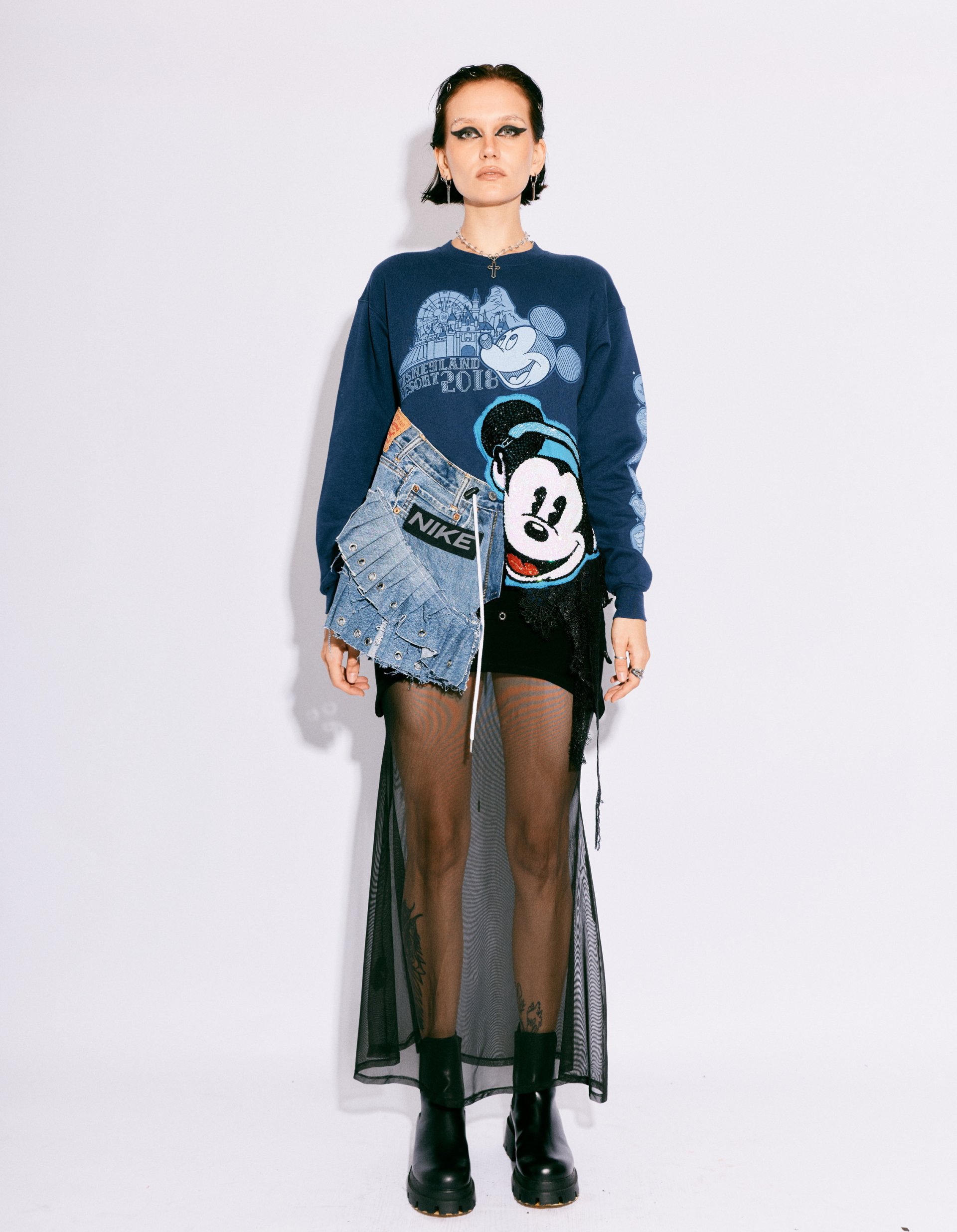 Every stitch narrates a story of revival — the clash of cartoon innocence and couture decadence. Layered lace trails off the hemline, while a hand-beaded Mickey patch dominates the front, giving the garment its avant-garde edge. This one-of-one piece blurs the boundaries between streetwear and art.