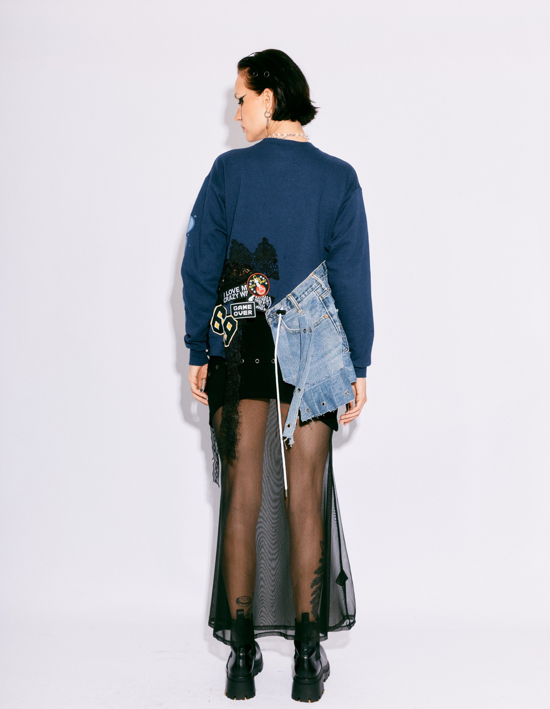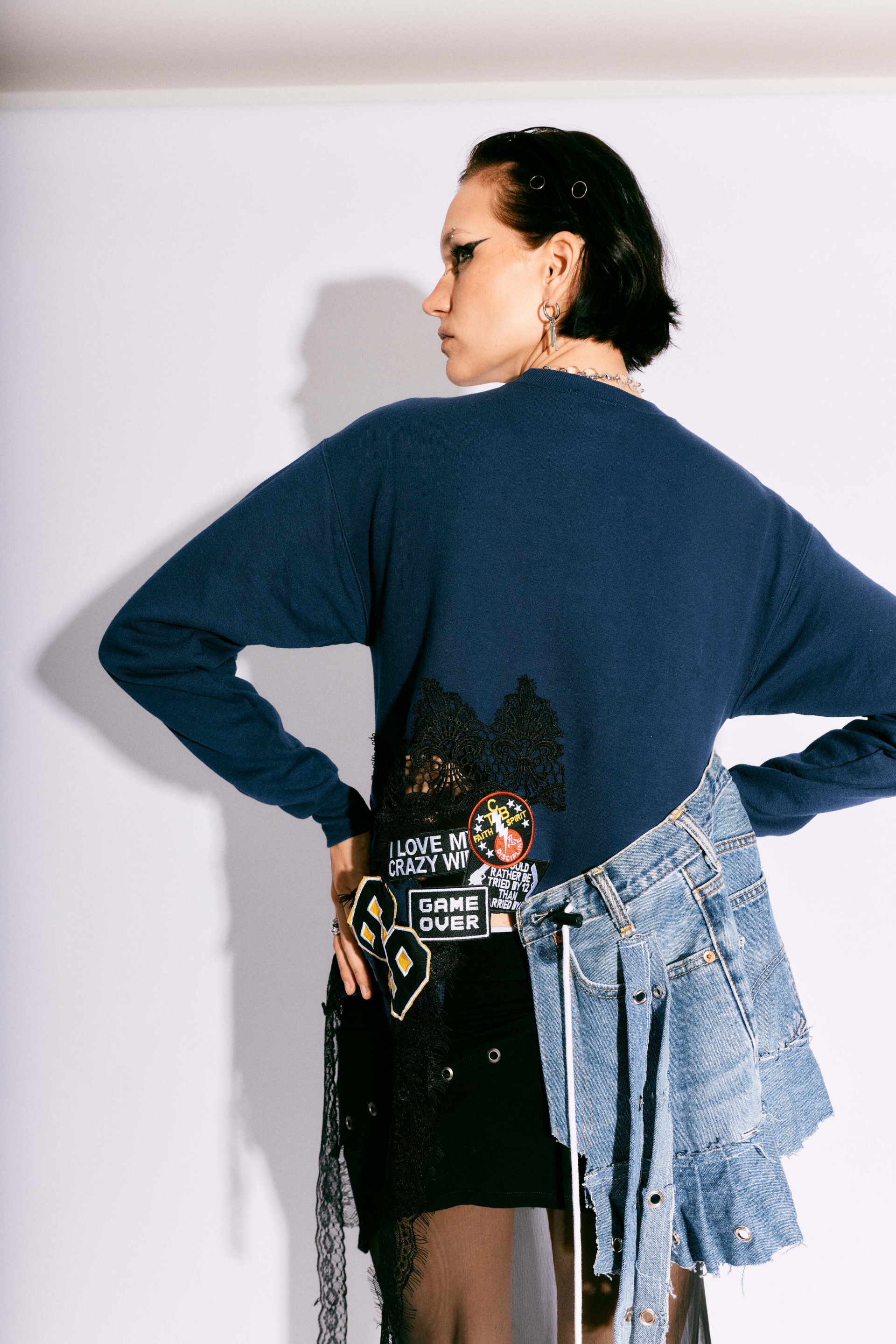 TARMAFIA’s DISNEYLAND REWORK SWEATER transforms vintage nostalgia into wearable couture rebellion. Crafted from an authentic vintage Disneyland 2016 sweatshirt, this piece is reimagined with hand-embroidered beadwork, sequin embellishments, and lace patch detailing, creating a new dialogue between pop culture and artisanal craftsmanship.