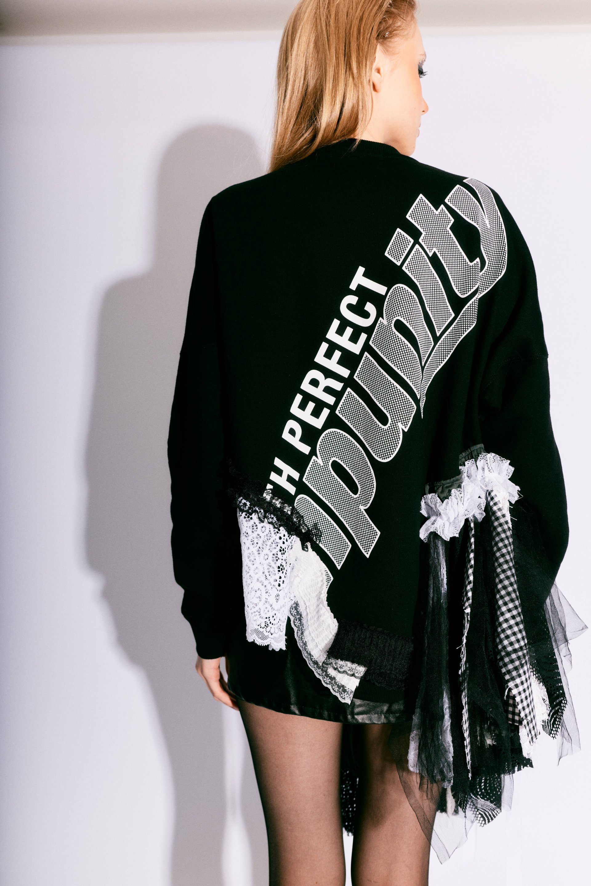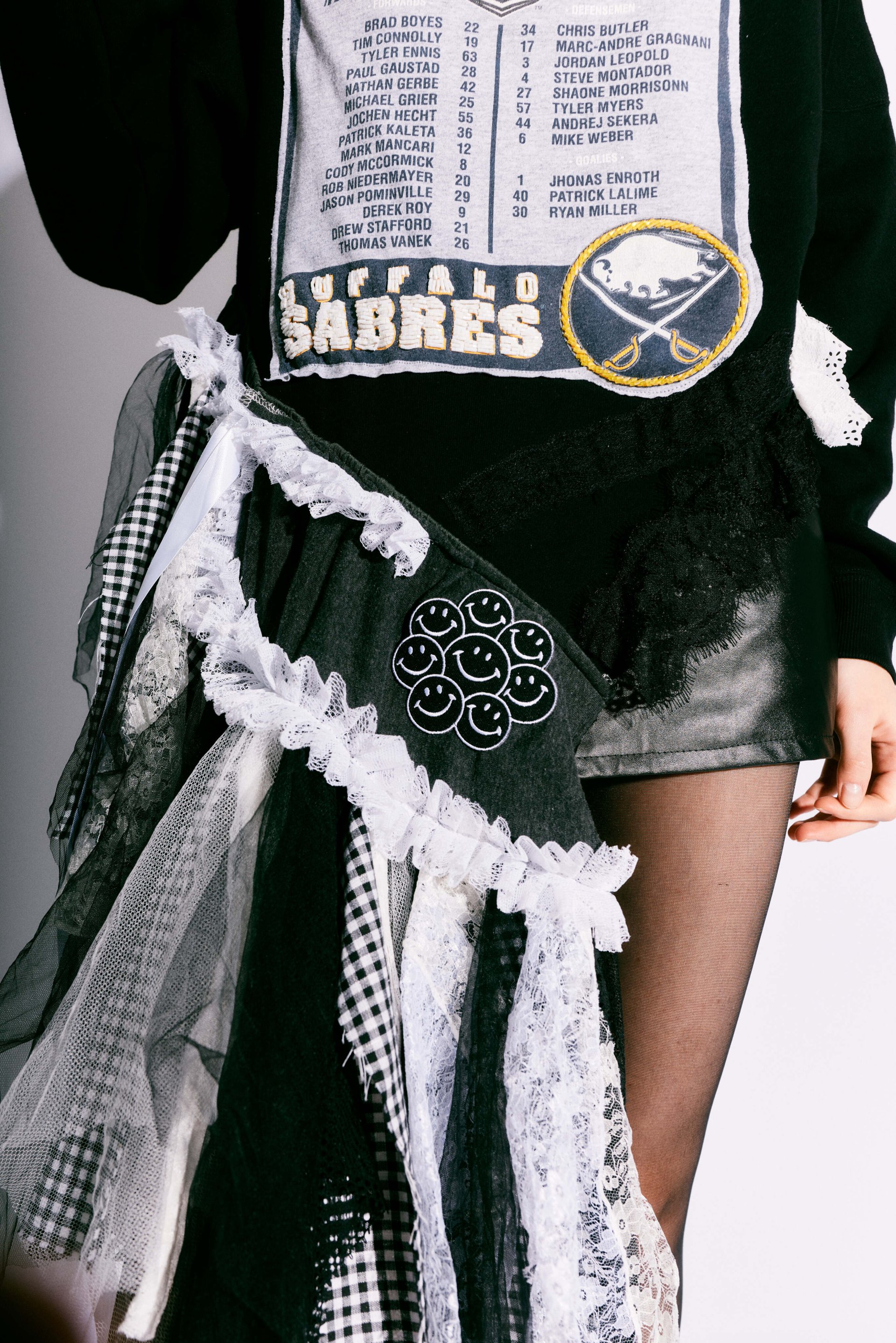 A fusion of street spirit and couture rebellion — the Stanley Lace Playoffs Sweatshirt redefines vintage sportswear through the lens of TARMAFIA artistry. Crafted from an authentic hockey playoff tee, reconstructed with lace, gingham, and hand-stitched tulle patchwork. A clash of toughness and tenderness — power meets poetry, grit meets grace.