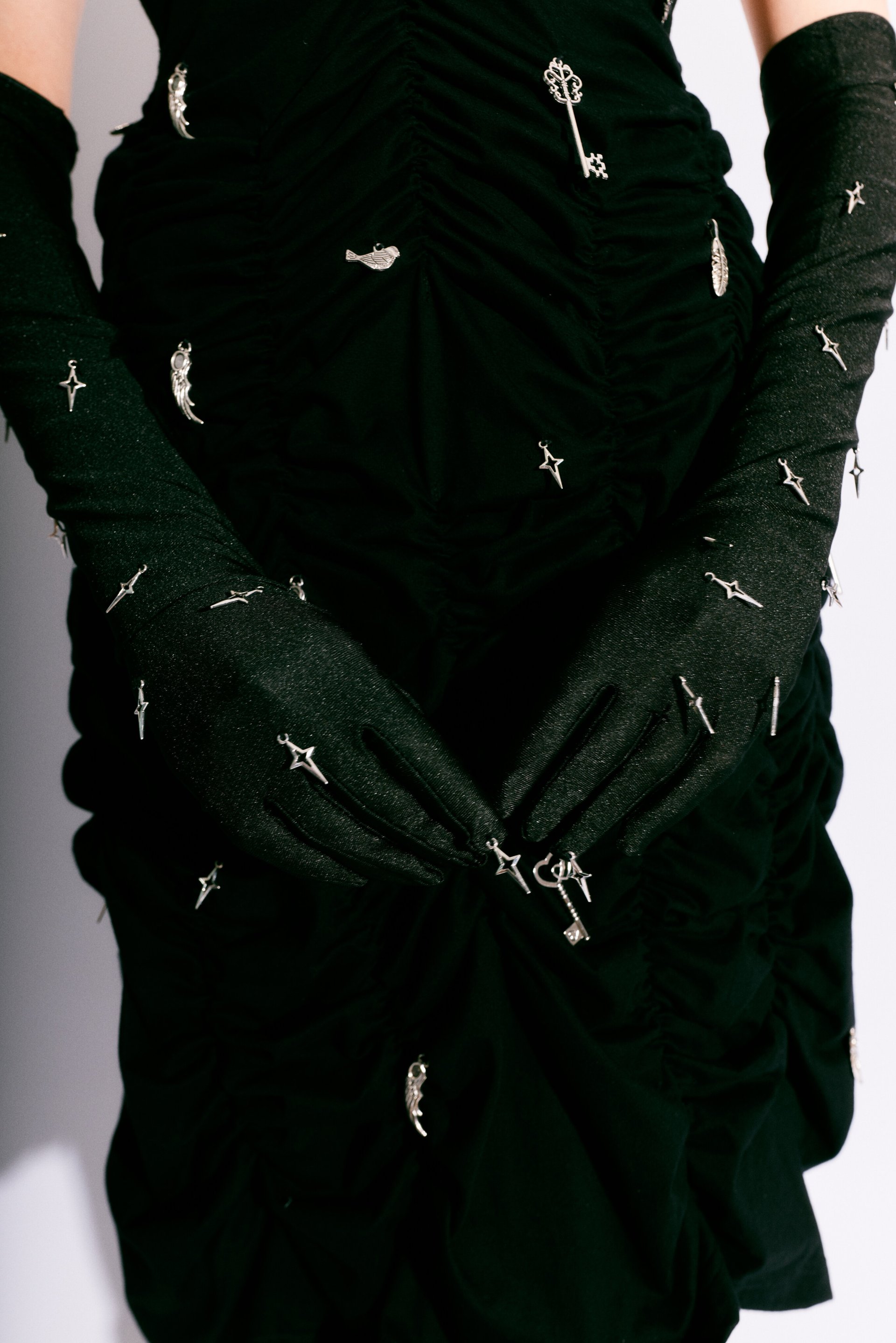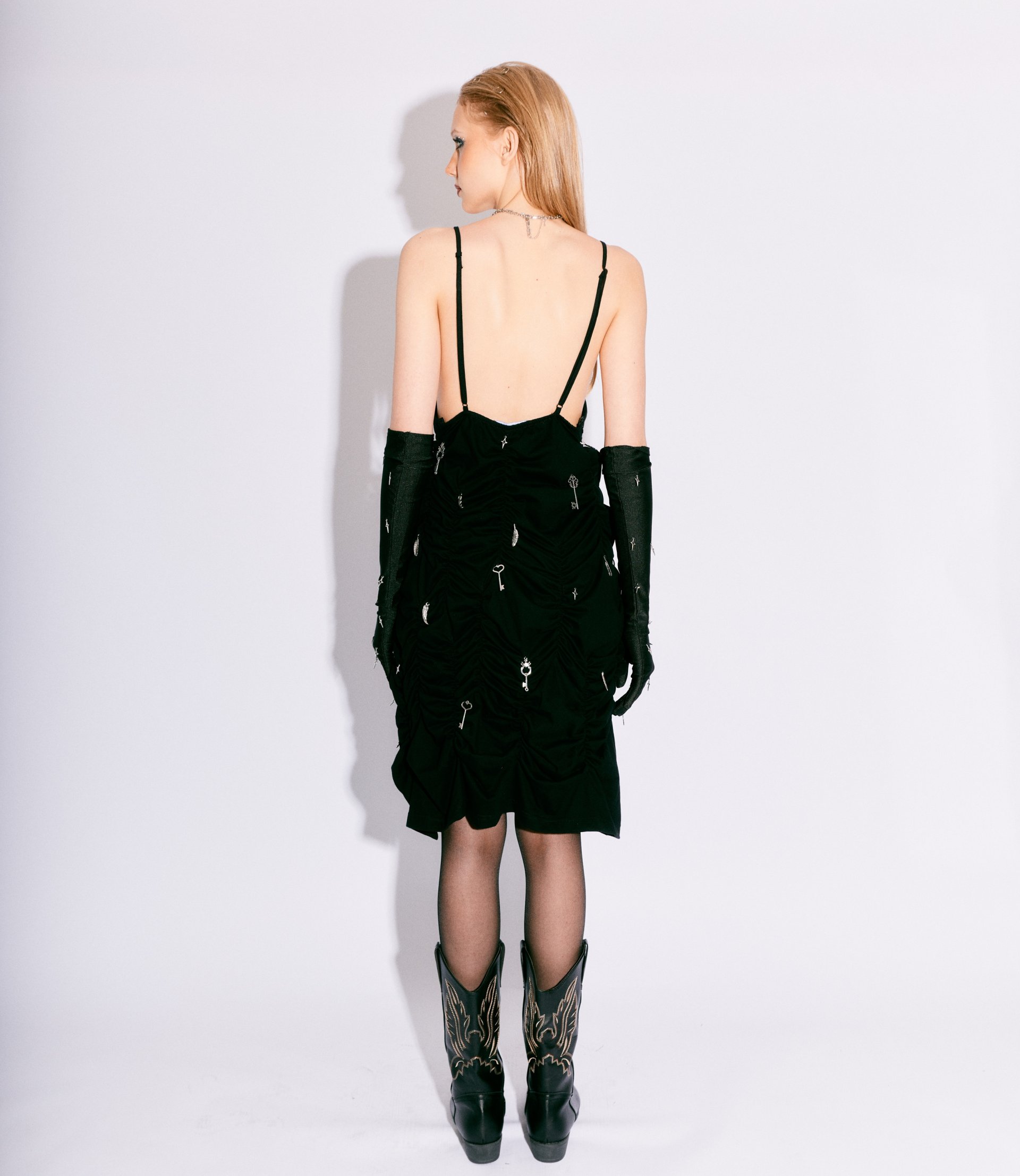 A graceful black dress designed with intricate ruching that enhances the body’s natural form. Adjustable straps ensure a perfect fit, while the silver key details create a refined yet mysterious statement. The ideal blend of elegance, allure, and artistic craftsmanship.