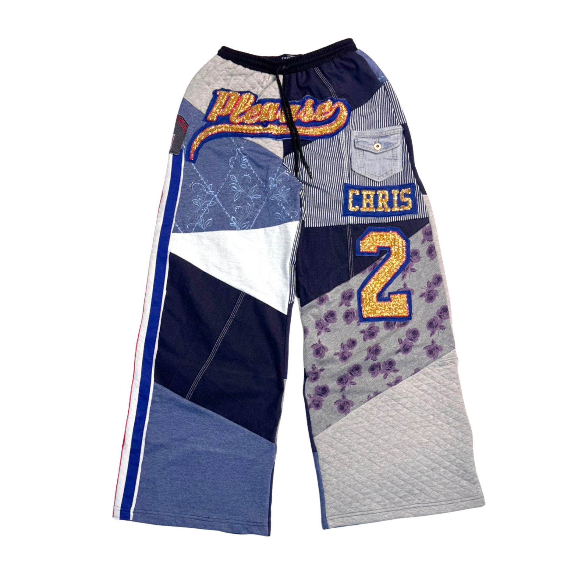 Upcycled wide-leg pants crafted from 5–7 vintage sweaters and denim jackets for a thicker, cozier feel. Bold color-block panels and functional back pockets. Elastic drawstring waist for comfort; unisex, relaxed fit. Each pair is custom and one-of-a-kind.