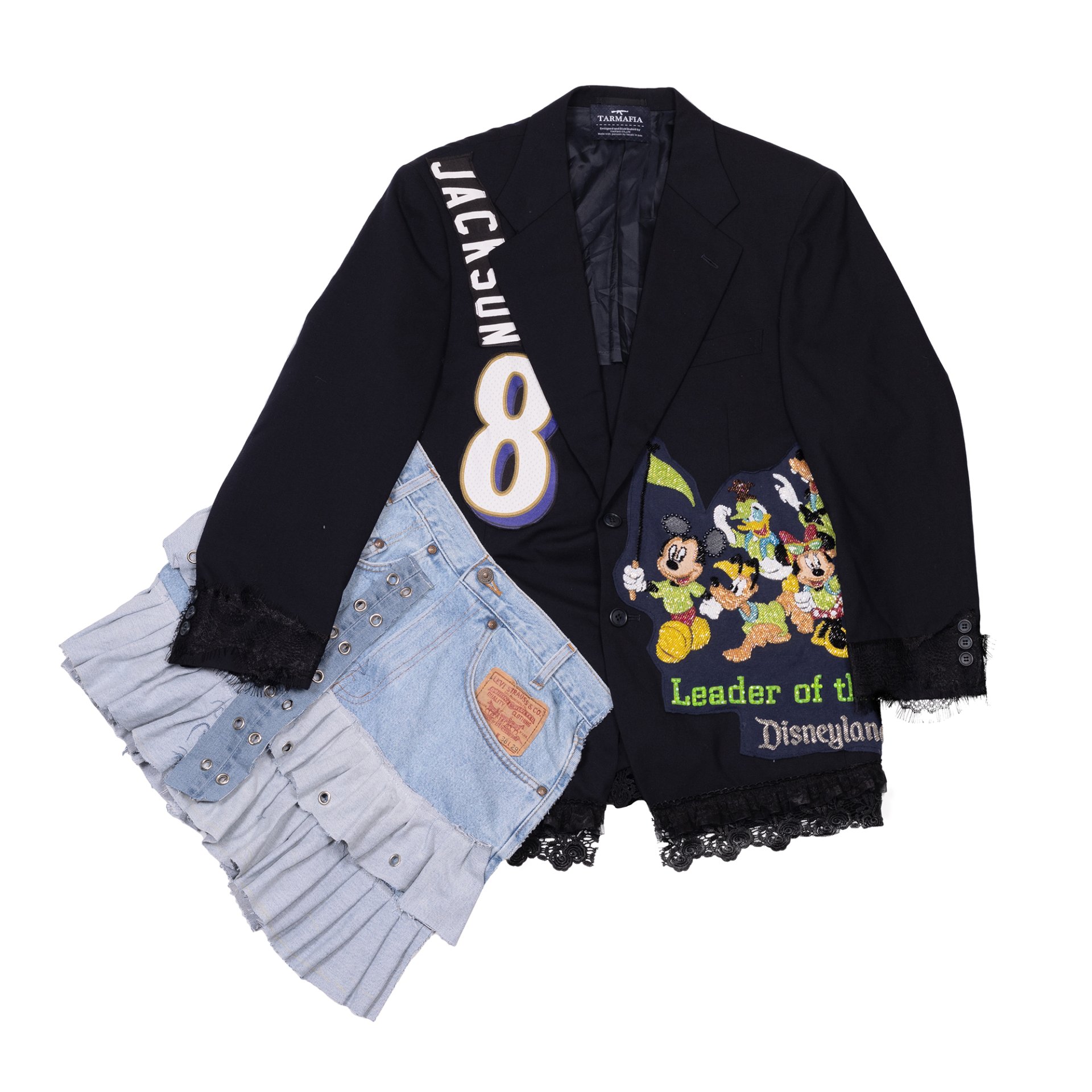 The black blazer transforms the language of victory into couture rebellion. Crafted from a vintage Super Bowl sweatshirt, each piece undergoes a bleaching ritual, evolving into a wearable relic of imperfection and pride.