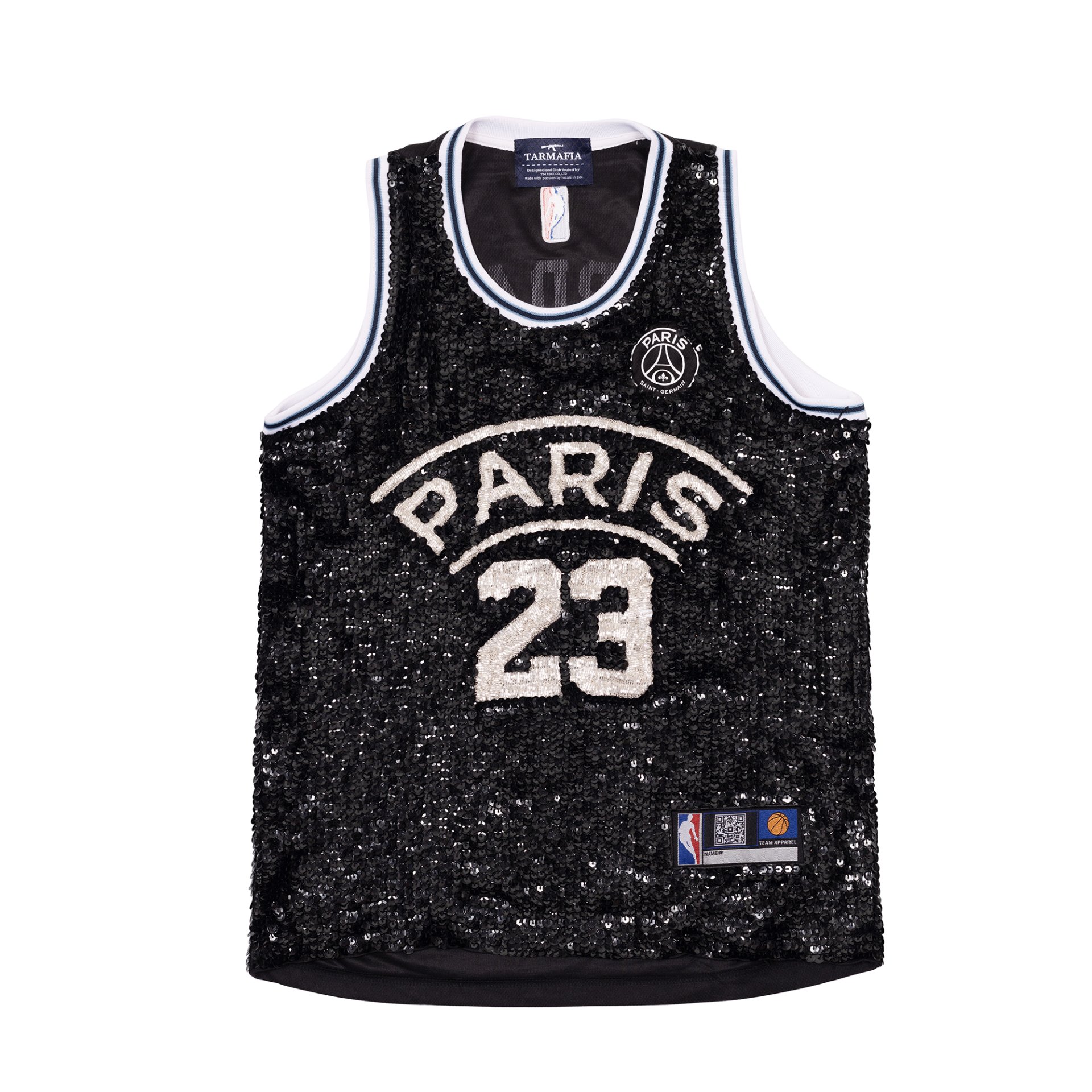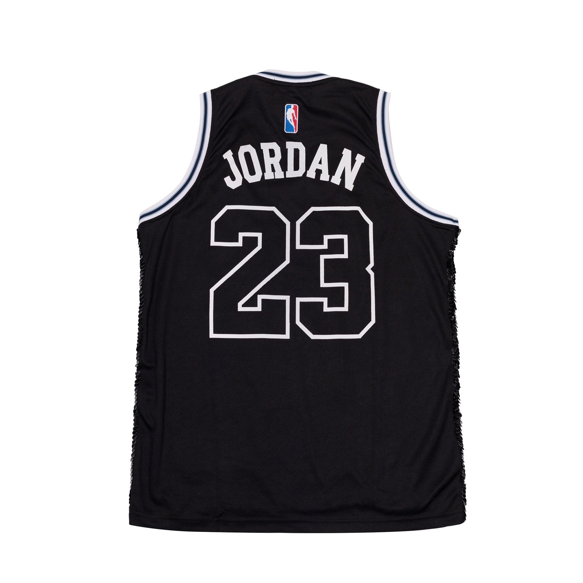 Black Jordan basketball jersey, reworked with hand-embroidered black sequins all over for a subtle shimmer-on-black effect. Oversized, sporty, and easy to style — a statement piece that blends streetwear energy with handcrafted detail