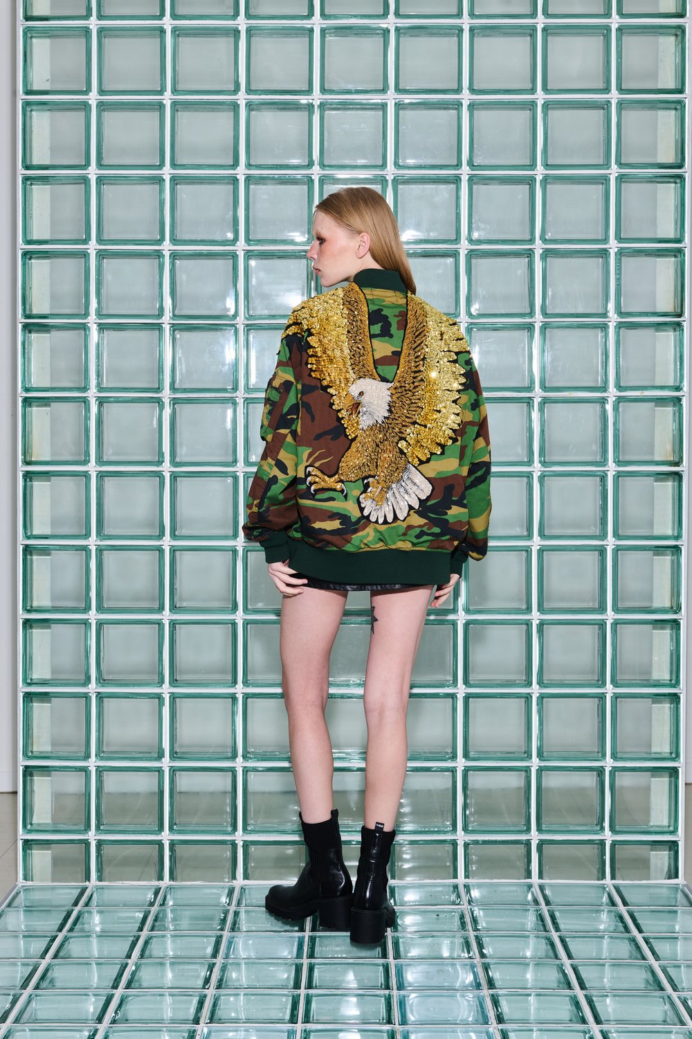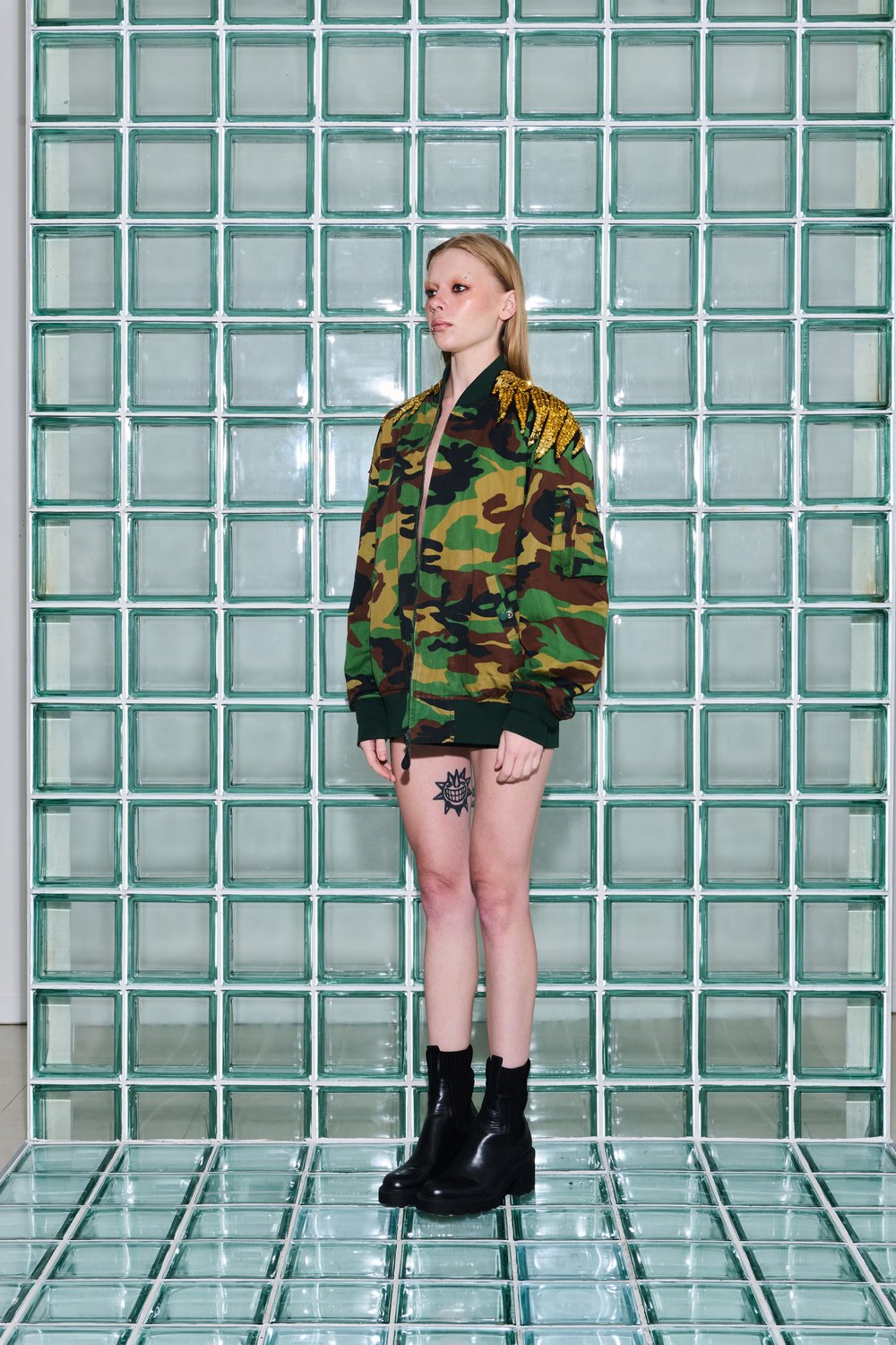 The Golden Talon Bomber is a striking fusion of military edge and artisanal craftsmanship. Cut from classic camouflage fabric, this statement piece is elevated by an intricate hand-embroidered eagle motif across the back—symbolizing power, freedom, and fearless individuality.