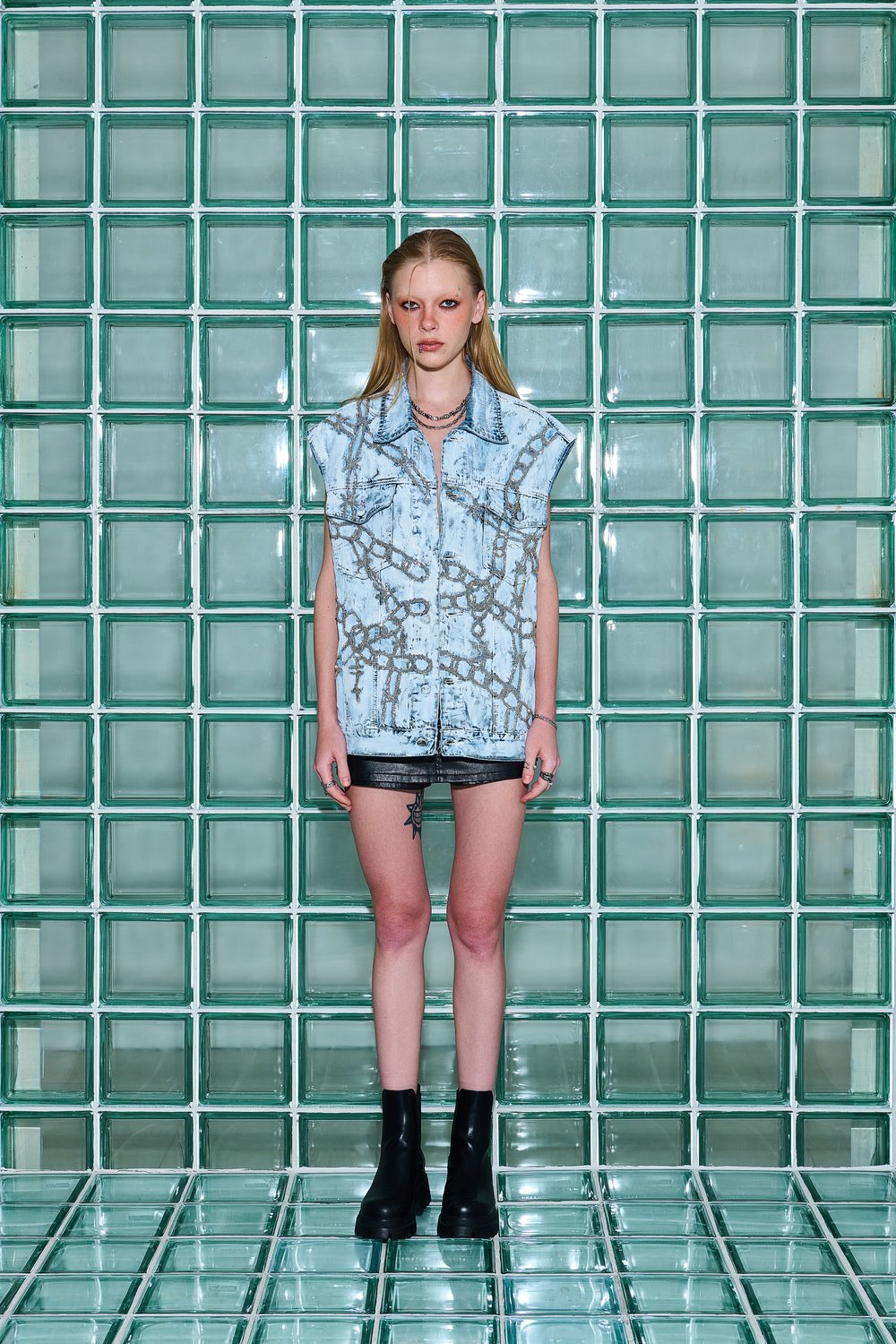 The White Noise Beaded Jacket is a bold collision of raw expression and refined craftsmanship. Built on a light-washed denim base, the surface is hand-painted with abstract white strokes—creating a chaotic yet controlled visual rhythm.