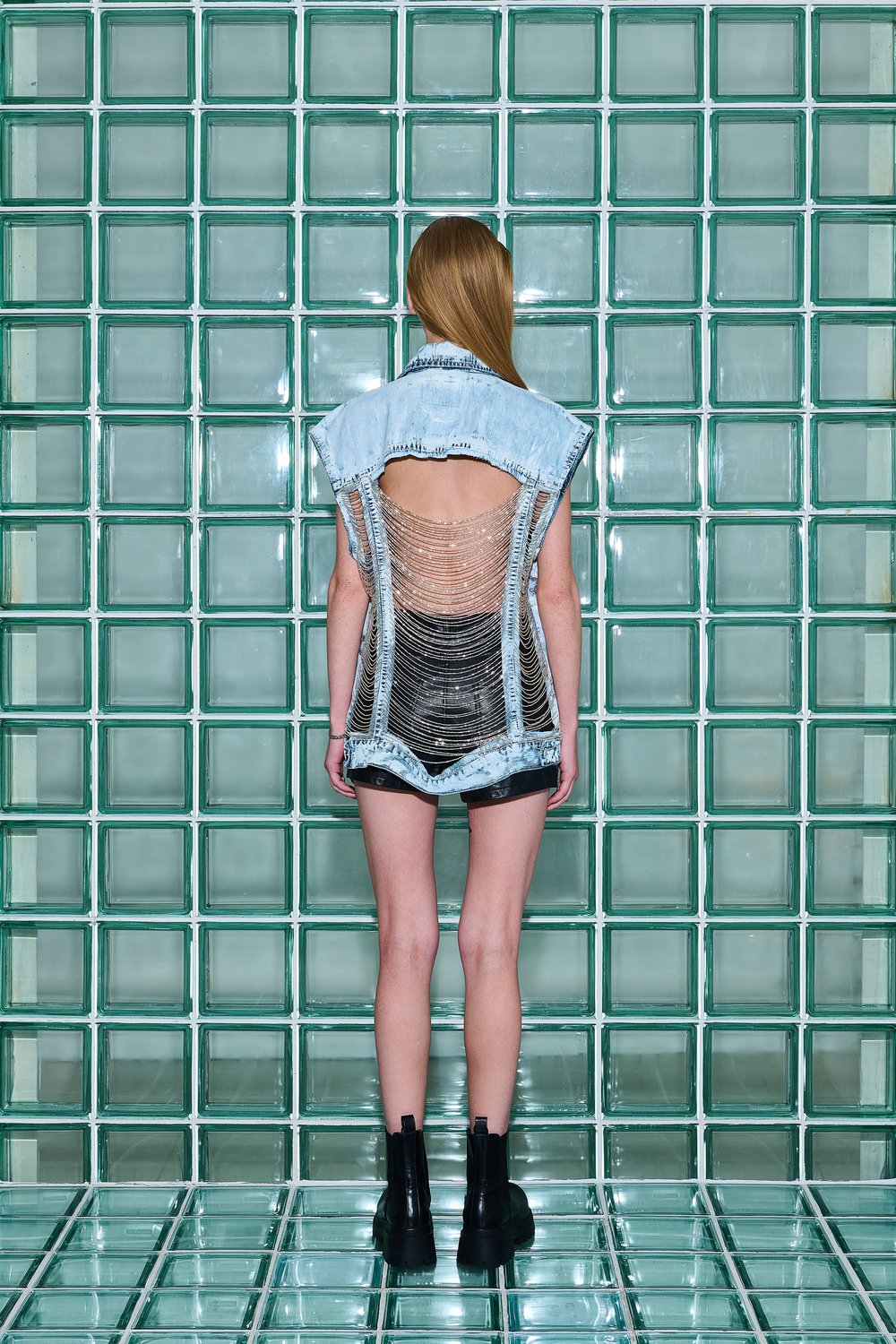 Layered over the painted foundation, hand-strung silver beads cascade across the body like liquid metal. The movement of each strand introduces a dynamic contrast between structure and fluidity, turning the garment into a living composition.