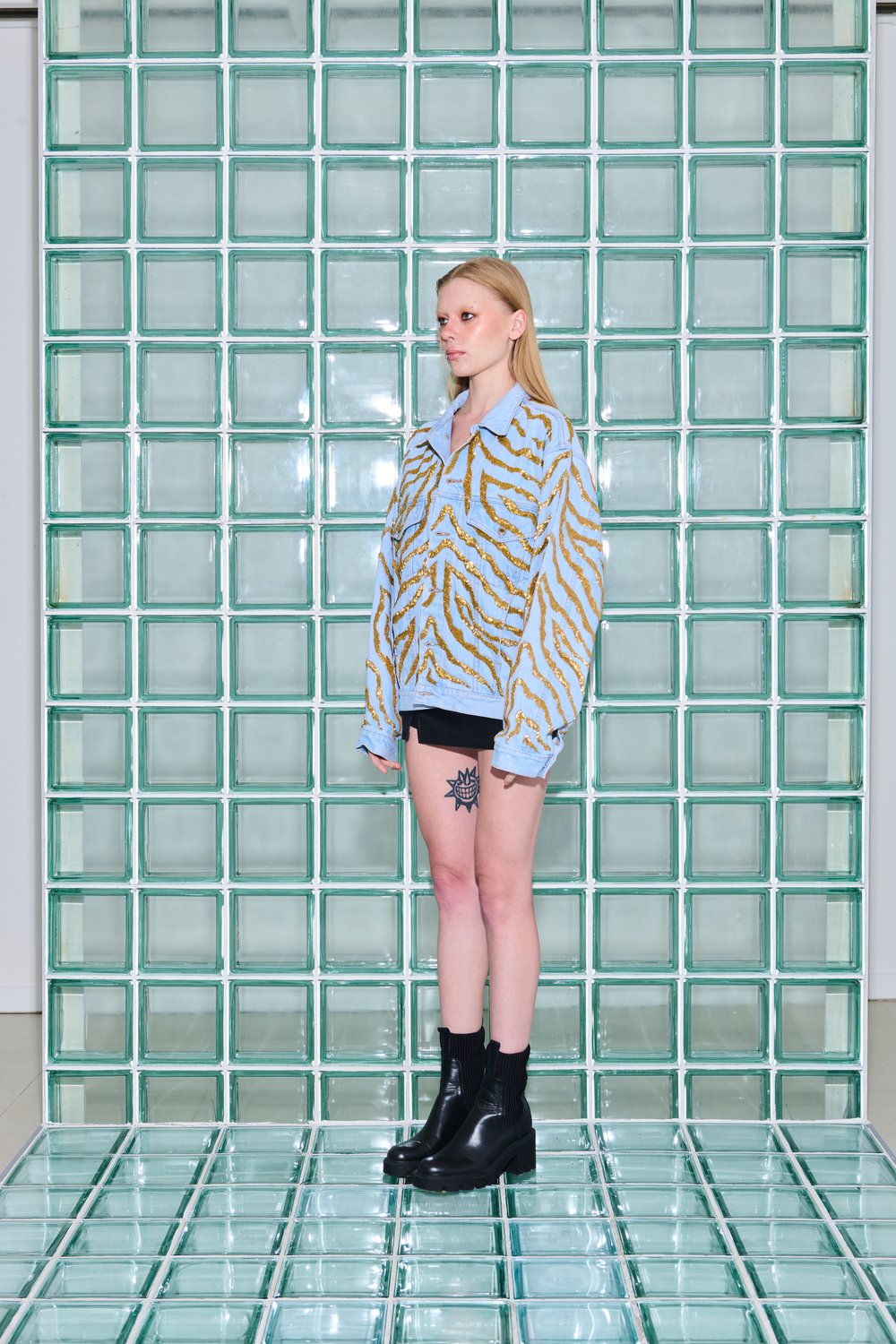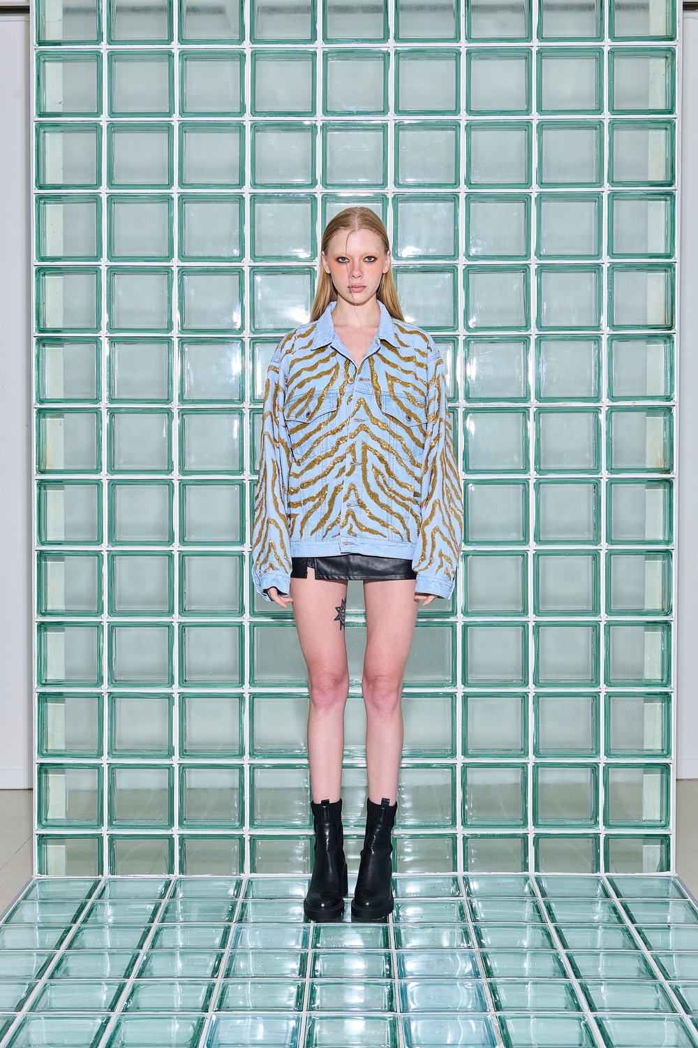 The design balances rugged streetwear aesthetics with high-fashion craftsmanship. Featuring a classic collar, front button closure, and functional pockets, it maintains timeless denim DNA while pushing visual boundaries with its striking texture and shimmer.